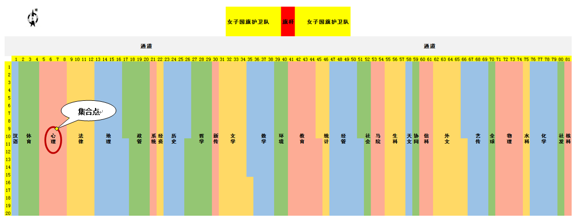 2、党支书确认本支部参加人员后,下载填写《2019年七一升旗参加人员统计表》(见附件),于6月28日(周五)中午12:00之前发送至学生党建邮箱:[email protected]。 3、活动当天,各党支部书记负责带队,组织本支部相关人员准时参加活动,并于7月1日早6点30分之前在京师广场98色花堂 集合点集合完毕(位置如下图所示),并组织签到。站立时,新发展党员站在队伍前面。 4、新发展党员和党支部书记原则上必须参加,如实在因特殊情况无法参加,请于6月28日(周五)中午12:00前向学部党委办公室(后主楼1430)提交纸质请假说明。 附:2019年七一升旗站立位置图 联系人:曹老师,58808189