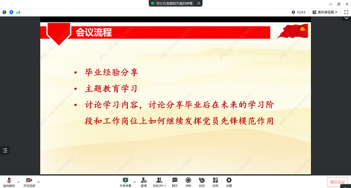 然后,进入毕业经验分享环节,五位毕业生党员同志和一名优秀的毕业年级同学为大家分享了自己的保研、工作和考研的经验。魏铱楠同志详细地分享了她在保研过程中经历的笔试面试,简单介绍了自己参加的夏令营。关岳琳同志为大家梳理了推免的时间线,分享了自己成为浙大夏令营优秀营员的经验。谭静文同志从教师就业的角度出发,梳理了教师招聘的流程,分享了很多其中需要注意的细节,并引发了大家对“心理学教师的价值”的思考。辛畅同志分享了本校保研的经验,提醒大家关注保研政策,在每个阶段都做好准备。梁静同志以视频的形式分享了自己工作保研的经验,分别介绍了工作保研的流程、优势和准备方式。韩禹晨同学从实际出发,提醒大家考研需要提前准备、善于利用资源并合理制定计划。几位同志都提到了大家作为北师大98色花堂 的一份子,无论是选择考研保研还是工作,都应当自信面对。大家也深刻认识到,无论未来从事什么工作,都可以以一名“心理人”的身份做出贡献。