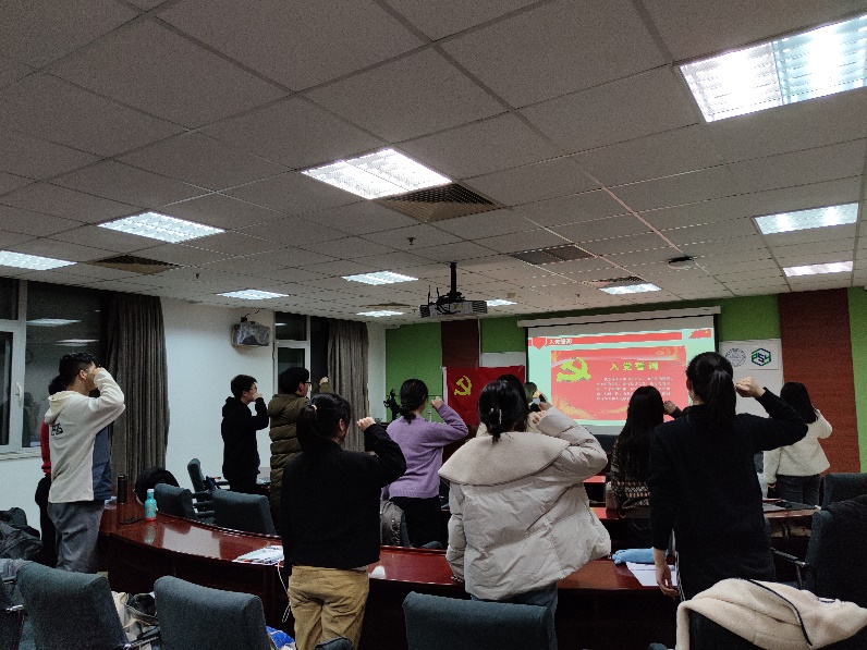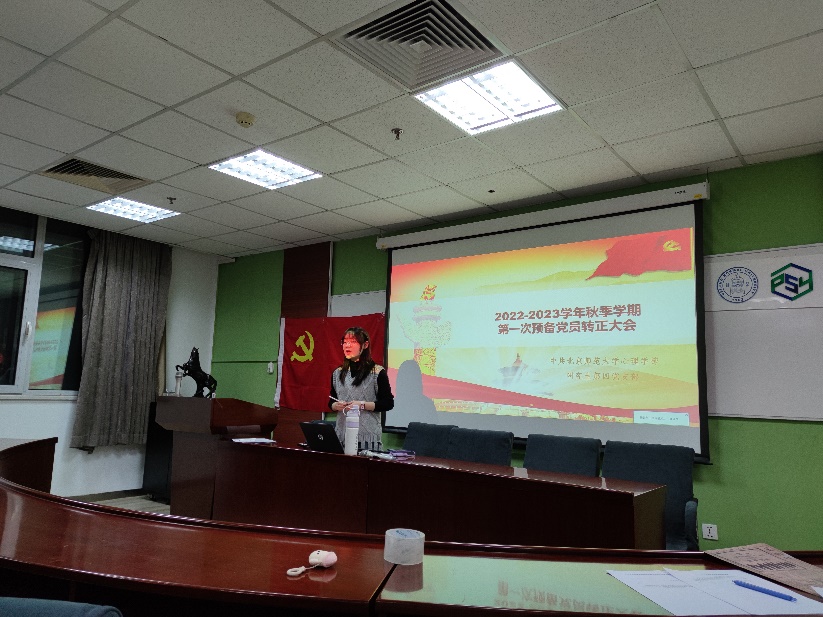 会议开始,党支部全体成员起立,合唱《国际歌》。党支部书记孟玉洁同志对此次党员转正大会的流程以及邓祎祎同志进行介绍。 邓祎祎同志宣读了自己的转正申请书,向党组织汇报了她成为预备党员一年来的思想、学习、工作等情况。该同志表示自己在思想方面,始终没有放松对中国共产党理论、政策方针和时事政治的学习和思考,努力在思想上与党组织保持高度一致;在学习方面,坚持“书山有路勤为径,学海无涯苦作舟”的信念,以“勤”、“苦”作为自身学习的勉励和要求,不断鞭策自己用知识武装头脑,在学术中勇攀高峰;在工作方面,始终以认真负责的态度完成党组织、导师和其他领导交代的任务。鉴于预备期满一年,特向党组织提出申请,转为中国共产党正式党员。