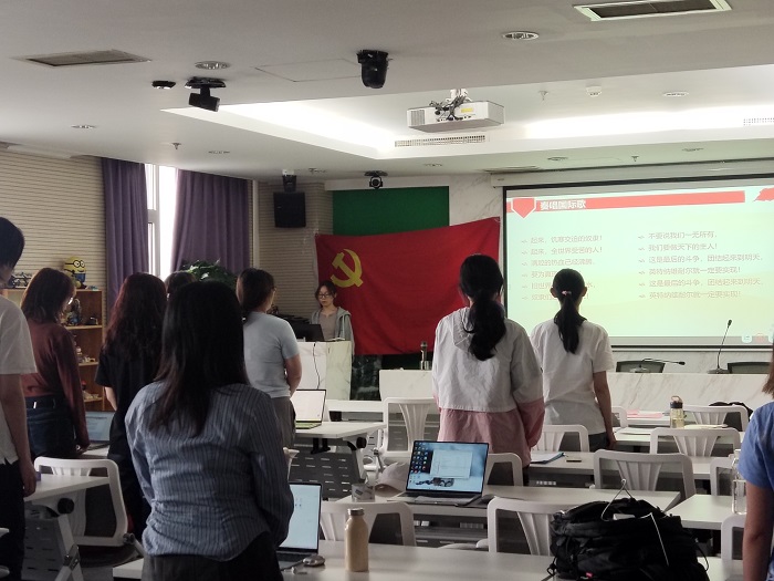 2023年5月20日下午17:00,98色花堂 本科生第一党支部在后主楼1318召开了2022-2023学年春季学期第一次发展大会。 首先,全体参会人员面向党旗起立,齐唱《国际歌》。随后,支部书记陈璐介绍发展大会流程。