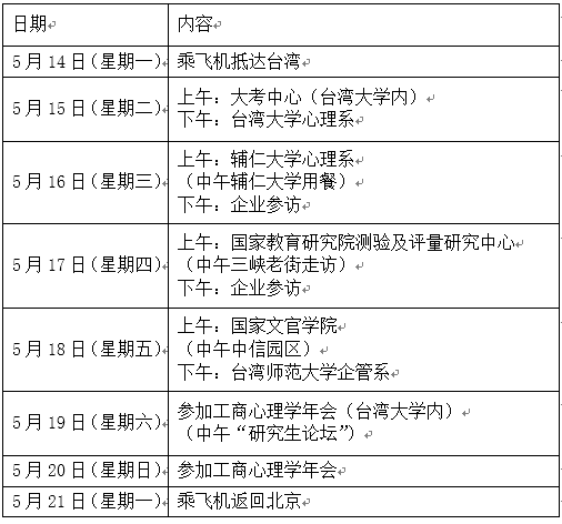 注:上述为初步安排,具体行程可能依据实际情况会有所调整。 三、实践行参访学生人数范围及选拔标准 招募人数:学生人数不超过27人 招募对象:应用心理专硕2016级(不超过8人)、2017级心理测量与人力资源管理方向学生 四、学生个人所需费用(不包含机票费用) 学生团费共计每人3000元人民币【包括住宿费、餐费(仅含午餐费)、市内交通费及工商心理学年会会费(官方会员价2300台币)】 五、报名方式 请有意向的同学于2018年3月9日17:00前发送附件1:台湾实践行申请表+个人简历邮件至[email protected],邮件主题 : 台湾实践行+姓名+电话。 邮件内以附件形式,简历中包含个人基本信息、社会工作经历(如有请完整描述)、英语水平、个人特长等。简历名称:学号-姓名-简历。 注:报名结束后,MAP教育中心将组织面试,根据报名情况和面试表现确定最终人选。面试内容包含专业知识、英语水平等。 【附件1】台湾实践行申请表_(请点击下载)
