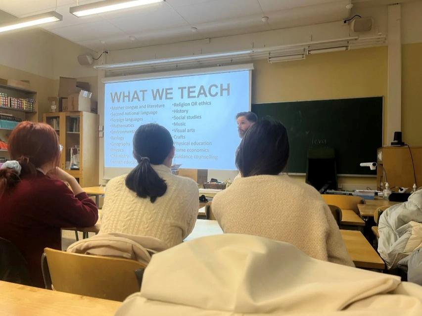 30日 下午,赫尔辛基大学的牛老师为我们介绍了她的主要研究领域——21世纪必需技能。这些知识不仅推动学生更好地适应生活,也启发了我们学习如何帮助学生促进这些技能发展。牛老师以自己的人生经历、女儿的学习经历为例,充分证明想要适应新世纪,不仅需要课本当中的知识,更需要这些综合的发展能力。在她的带领下,我们按小组反思并分享了自己具备的优秀能力,努力领会核心素养的重点所在。 随后,我们前往附近的师范学校,请教了学校老师在教育教学实践中的心得,并实际参观旁听了正在进行的英语课,发现学生与老师以非常平等包容的方式相处。通过介绍我们了解到芬兰对教师培养非常重视,师范学校特别设计了针对不同阶段中学生的教师技能培养课程,而每位老师在探索自己教育教学的方式时具有极高灵活度,教育系统对教师独特的创新非常包容。同时对那些学习能力稍弱的学生,学校会单独配有特殊帮助教师进行辅助,直到学生的能力能够跟上平均水平。