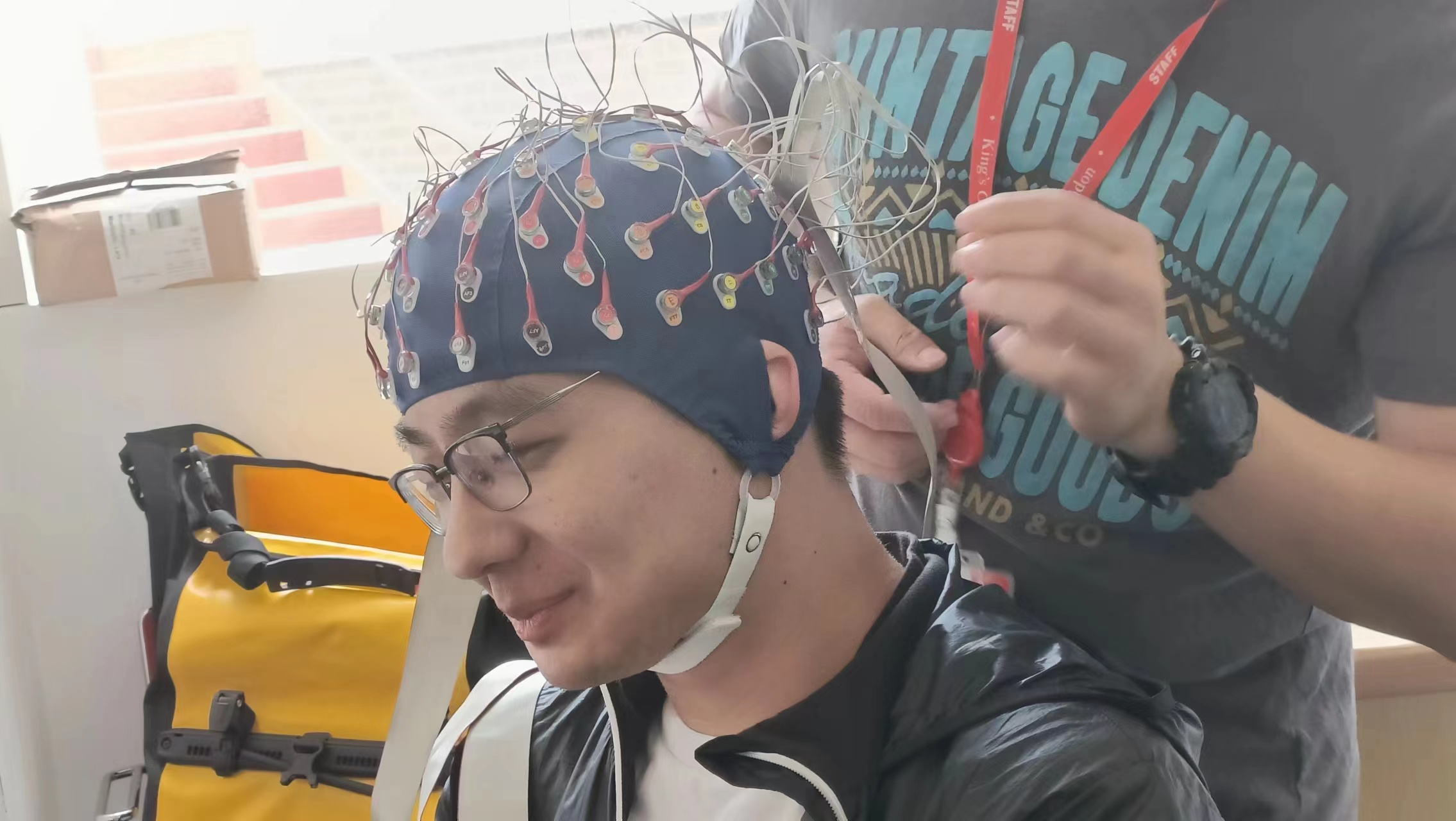 图1 在首都国际机场的合照 2 课程学习 初到伦敦的第二天,我们便开始了课程学习。在KCL的课堂上,我们主要围绕变态心理学和社会心理学两大主题,对其中的关键课题进行了探究。这一部分内容恰好对应了北师大98色花堂 大三上学期即将要学习的内容,所以这次访学可以看作是为我们大三专业课的预习。 在课程中,最令我印象深刻的便是认知神经科学相关仪器原理的演示,包括TMS(经颅磁刺激)和EEG(脑电)。我更是亲自作为被试,首次带上了脑电设备,感受“高科技”测量带来的便利。在国内的课程中,我们很少有机会亲身接触到这些高精尖设备,通常老师只是在ppt上一带而过,而对于其操作方式和作用原理,只能通过视频资料或者自行脑补的方式来理解,所以对于每种不同设备的了解是十分有限的。正所谓“纸上得来终觉浅,绝知此事要躬行”,在KCL的课堂上,我得以切身体验磁刺激穿过皮肤时的感受,也亲眼看到自己在眨眼时脑电波的微小变化,这为我理解这些仪器的操作与原理提供了一个直接的通道,使我对这些先进的科学设备有了更加直观的理解。