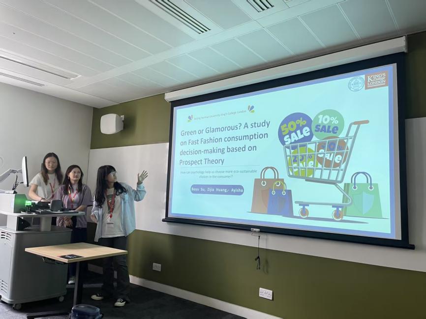 这三门课程共同支撑起我们对于心理学应用领域的全新认知框架。它们让我明白,心理学不仅是解释现象的工具,更是干预行为、促进健康、服务社会的强大力量。 除了三位教授的授课之外,小组汇报是另一个让我受益匪浅的部分。课程最后的presentation要求我们在8分钟内完成对于“心理学如何在交通、消费与能源领域帮助我们做出更多生态可持续的选择?”这一问题的研究与回答,我们小组的课题是《Green or Glamorous? A study on Fast Fashion consumption decision-making based on Prospect Theory》。从确定选题、文献调研、构建模型到设计干预方案,我们经历了无数次激烈的头脑风暴。汇报当天,看着前面四个小组精彩纷呈的展示,压力与动力并存。轮到我们时,我们尽可能清晰、自信地阐述了我们的研究设计与发现,获得了老师和同学们的鼓励。