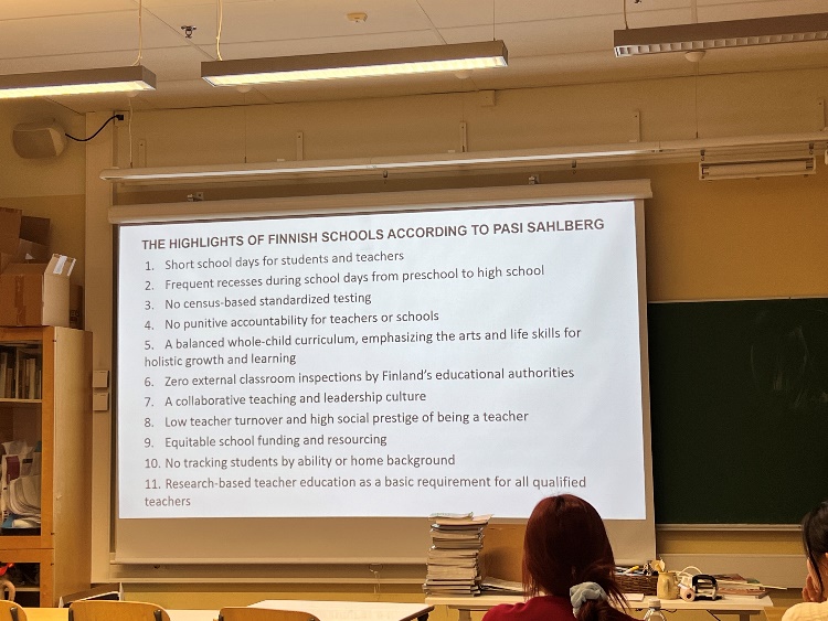三、 世界第一的芬兰教育,究竟好在哪? 芬兰以其优质公平的教育闻名世界,传闻中“世界第一”的芬兰教育,究竟好在哪?带着这个问题,我们探访了隶属于赫尔辛基大学的Normal Lyceum学校,这是一所综合学校,下至小学一年级,上至高三,(除了小学六年级)全年龄段的学生均在这里上学,此外,这里还是赫尔辛基大学师范教育的主阵地。学校的老师向我们讲解了芬兰的教育体系和教师培养路径。最值得一提的,便是芬兰法律要求所有的老师都必须得拥有一个硕士学位,这确保了教师队伍整体的可靠性。此外,老师还提到,在芬兰,教师有着较高的社会赞许和薪酬体系。在学生层面,芬兰教育整体并不强调“拔尖”教育,而是希望每一个人都不要落后,所以,在芬兰,有大约20%的学生会接受特殊教育,以帮助他们更好地跟上别人。 最让我们印象深刻的一句话是“芬兰教育从不向任何一个人关上门”,事实也确实是这样,我们看到芬兰打通了职业大学和大学之间的界限,假若是职业学校毕业的学生,同样也能去大学上学。在我们后续的观察中,赫大的硕士生和博士生群体中,也不鲜有四五十岁或是已经退休的人,对于他们来说,如若对什么话题或是行业感兴趣,最好的办法就是再去读一个学位。“终身学习”的概念,已经在芬兰这片土壤上生根发芽。 四、 芬兰一瞥 最后想聊一聊在芬兰的课余生活:从赫尔辛基大学的Uni Café,到美式快餐RAX,芬兰的餐食或许对于中国胃的我们来说一时还难以接受,不过也曾品尝了芬兰的传统菜肴三文鱼汤,体验了芬兰本土快餐品牌Hesburger,或许从芬兰的饮食文化中,也能些许地瞥见当地人对自然的理解和情感。 在芬兰,我们还有幸参观了当地的设计博物馆,建筑博物馆以及阿黛侬美术馆。阿黛侬美术馆,又名芬兰国家美术馆,据网上的介绍所说,是世界上第一家收藏梵高画作的美术馆。巧的是,参观当天,正碰上印象派画作的特展展出,有机会一睹大家画作真容,吾又何其有幸也。在买票时还曾发生了一件趣事:18到24周岁的学生购买美术馆门票可享受折扣,当我拿出护照准备递给他们检查时,他们婉拒了:“哦!我们不看这个。”或许真是如牛老师所说,芬兰人与人之间的交往,是建立在信任上的。 10天9晚的旅程弹指一挥间,从图尔库搭乘VR火车回赫尔辛基时,我坐在靠窗的座位上,窗外是无垠的白雪,森林,零星的房屋和湖蓝的天空,这些景色在眼前流动,耳机里响着的是坂本龙一的Merry Christmas Mr. Lawrence 似乎也是在映衬这景色,偶见一栋可爱的屋子,想拿起手机拍照时却又一闪而过了,或许就这样吧,把眼前的景象留在心里,就行了。