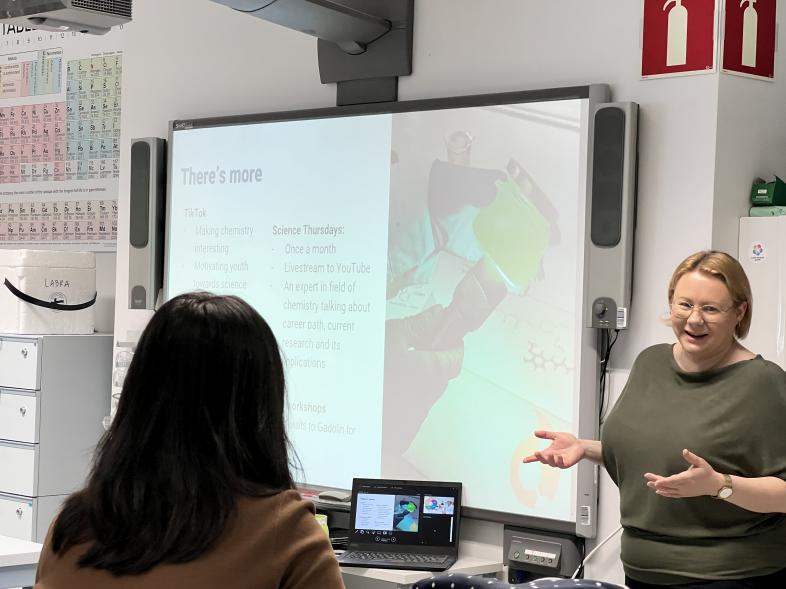 到芬兰的第一天上午,LUMA中心的主任Maija就向我们介绍了芬兰的教育体系,LUMA中心的使命和基于证据的教育。在她的介绍下,我们一步步走入芬兰社会的教育逻辑和教学生态中去。下午,我们走进赫尔辛基大学Gadolin实验室,亲手体验了干冰和洗洁精吹泡泡,并从中了解到Gadolin实验室是如何通过生活中常见的物品,设计化学实验,并让不同年龄段的学生从这些化学现象中收获知识的。