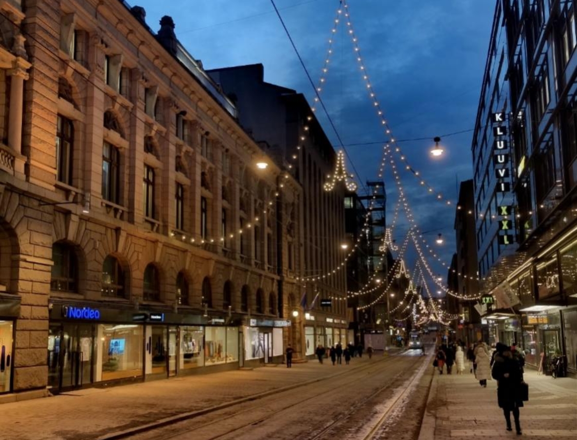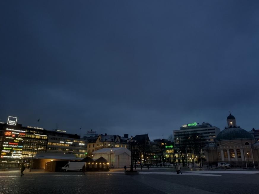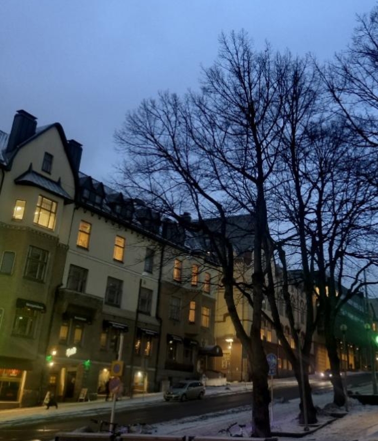 图11 赫尔辛基街道 芬兰人的生活方式和我们不太一样,即便在赫尔辛基最繁华的CITY CENTER,到了晚上,街道上的行人也会变很少,除了商场和零星的店铺,很多门店甚至是饭店都很早就关门了,街道上的氛围非常冷清。但芬兰人很友善。虽然来芬兰之前看了很多不同的说法,芬兰人很内向社恐等等,但我们在芬兰遇到的路人也都非常和蔼可爱。在议会广场,一对夫妇主动帮助我们拍照;在集市广场的路口,一个阿姨看我们不熟悉路线又主动询问我们是否需要帮助;在K超,我向售货员询问物品位置,售货员表示自己的英语不太好,联系了同事来和我们沟通。这些小小的善良和温暖,对在陌生环境初来乍到的我来说,真的很惊喜,也很感激。