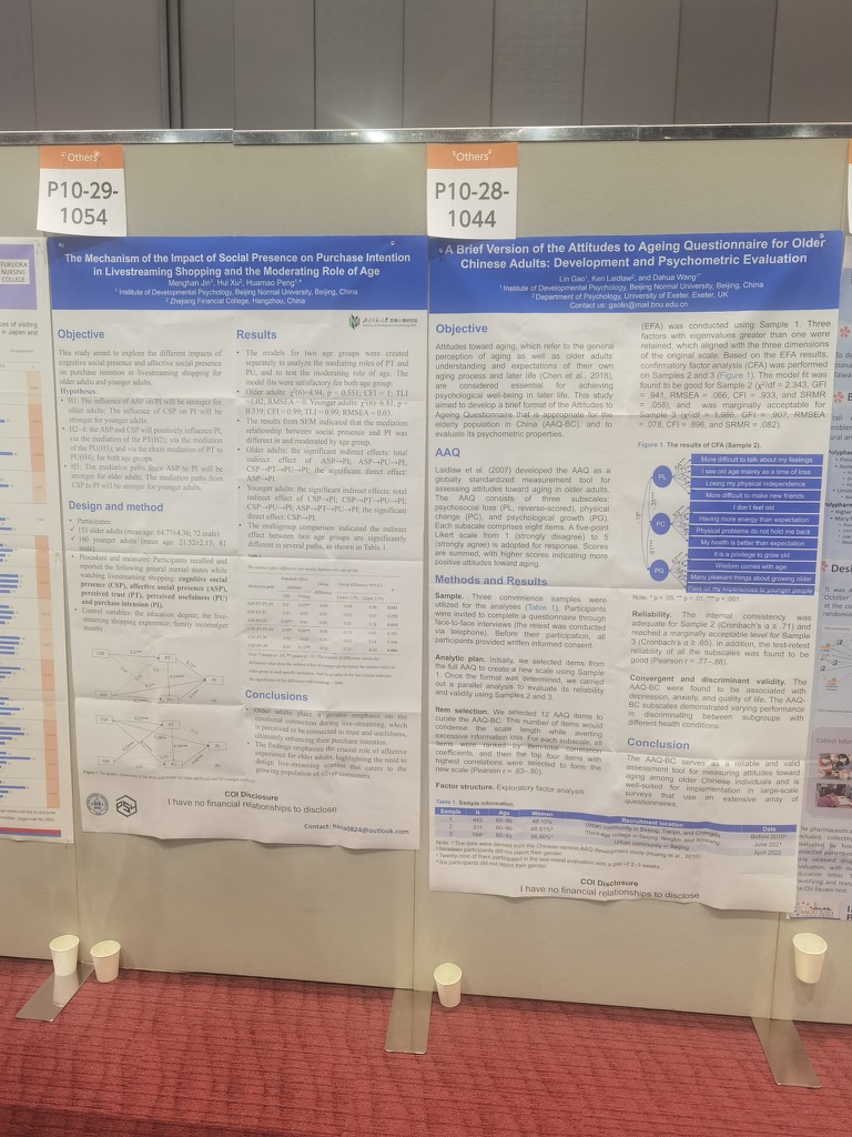我们本次参会的行程安排如下: 6月11日:早上乘坐飞机于北京首都机场飞往日本羽田机场。中午在羽田机场降落,我们中午在机场吃了午饭,然后在机场办理购买日本公交卡。下午三四点左右我们从羽田机场搭乘地铁前往横滨的住宿酒店。我们入住的是横滨樱花町华盛顿酒店。办理完入住之后,我们外出逛了中华街,去一家日式烧鸟店吃了晚饭,然后晚上在横滨闲逛欣赏了横滨美丽的夜景。 6月12日:我们会议的地点是太平洋会议中心,离我们住宿的酒店较近,我们上午乘坐公交来到了会场。在会场听了主旨报告。下午会议结束之后我们乘坐地铁去东京逛了一圈,在东京的商场买了些东西,晚上吃了很美味的拉面。晚上打卡了雨中的东京铁塔,然后乘坐地铁回到了横滨的酒店。 6月13日:我们上午来到了会场,主要在海报会场参观张贴的海报,与参会人员有了密切的交流。中午在附近的商场吃了午饭,下午继续在会场交流学习。下午会议结束之后我们前往横滨站附近吃了晚饭,吃了一顿美味的日式烧肉。 6月14日:我们上午来到了会场,在海报张贴会场与其他参会的研究人员相互交流和学习。中午去参观了附近的泡面博物馆,下午回来张贴自己的海报,继续会议交流。会议结束之后再樱木町附近逛了逛,在附近的野毛夜市逛了逛,感受了日本的夜市氛围,吃了寿司和烤生蚝。 6月15日:我们早上早早地起床收拾行李在酒店退宿,然后出发前往东京羽田机场。中午两点左右我们乘坐飞机飞回了首都国际机场,回到了北京,回到了学校。 本人在会议张贴海报的研究 报告类别:海报张贴 报告中午名称:社会临场感对直播购物购买意愿的影响机制及年龄的调节作用 报告英文名称:the mechanism of the impact of social presence on purchase intention in livestreaming shopping and the moderating role of age 海报张贴时间:6月14日中午2:00-3:00