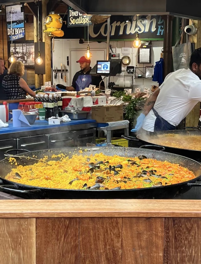 相比于其他大都市,仅就个人这两周以来的感受而言,伦敦的生活节奏算不上很快。早上九点开始上课,大部分的学习、作业任务都能控制在课上完成,下午三点多放学后的时间就能自由支配。周末格林威治公园的草坪上有许多野餐的当地人,漫步于此能体会到浓浓的生活情调:生活的意义不是在追赶,而仅仅是生活——这可能也是网上流行的所谓“松弛感”。再繁忙的集市摊主也会在五点多闭摊,大部分商店很早就会关门,街头艺人抱着吉他自娱自乐唱着歌,一大群鸽子咕咕叫着围住撒食的老人。人们不仅仅投入工作,也有充分的时间陪伴家庭,做自己想做的事情。但是不可否认的是,这种“松弛感”也会不时造成一些麻烦:例如公交车司机不知为何半路“撂摊子”,地铁某天突然停运,给通勤造成许多不便。 在伦敦当然也像平时上学那样,除了上课之外,每天费尽心思想得都是今天吃啥。我坚持用“食物”而不是“美食”指代这里的菜品,的确是无法昧着自己的良心:英国的食物确实不负享誉世界的“盛名”,我头两天在吃食堂里饭的每一口都感到十分新奇,忍不住和朋友互猜菜里到底包含了什么食材、这些食材到底经历过什么变成了这盘混合物。在无法忍受吃一半剩一半然后买块可颂(这是面包里唯一不会甜到发齁的)充饥这样的日子后我和朋友们探索了周边的餐馆,靠着网上的推荐度过那两周。不可否认的是伦敦的食物并非全都一无是处,比如一些非英国本土的海鲜饭、披萨、我吃过最好吃的海鲜炒面(顺便一提这是从中餐外卖软件熊猫外卖淘到的),未经英国人灵机一动加入调料仅仅油炸加工的炸鱼薯条还是十分推荐。