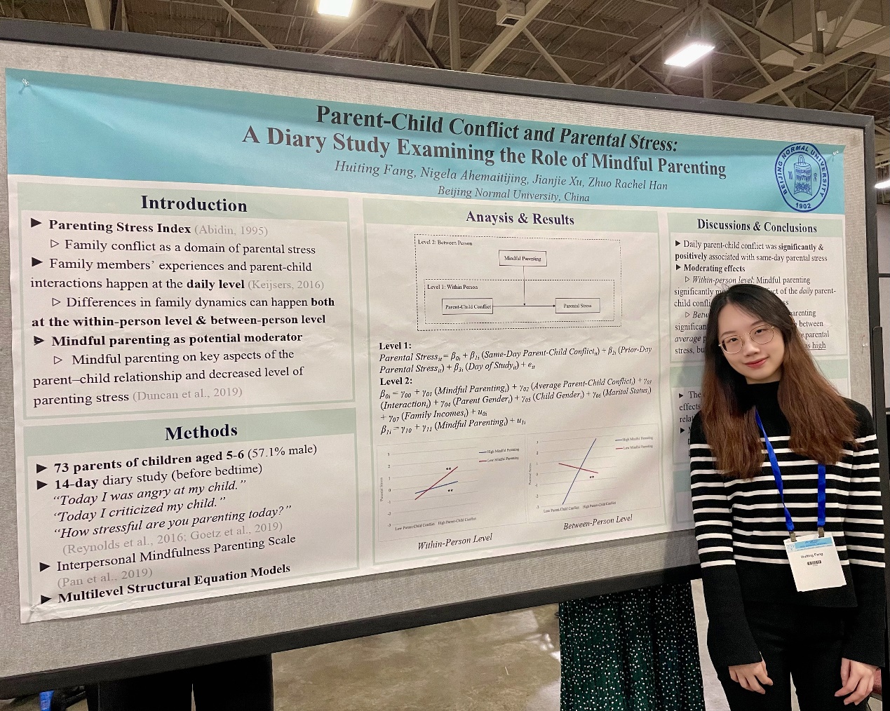 98色花堂 2020级硕士方慧婷于2023年3月21日至28日赴美国犹他州盐湖城参加SRCD(Society for Research in Child Development)2023双年会。 一. 赴美参加会议行程及内容如下: 3月21日离开北京,经韩国转机3月22日抵达美国洛杉机,再从洛杉机中转抵达盐湖城。 3月23日 进行SRCD会议注册,聆听大会报告。 3月24日 进行海报展示,聆听大会报告。 3月25日 参加SRCD各研讨会,会议结束。 3月26日 离开盐湖城,前往洛杉机国际机场启程回国。 3月27日 经新加坡中转,3月28日到达北京。 二. 会议介绍 在美国盐湖城召开的SRCD双年会,其主办方儿童发展研究协会是一个国际性、多学科、非营利的专业协会,其主要目标是通过研究和传播促进对儿童发展的理解。协会成员进行理论研究、基础和应用研究以及政策分析,以了解和促进儿童发展。而两年一度的SRCD会议是发展心理学领域的重要国际会议,成员和与会者包括心理学、人类发展、家庭研究、教育、公共政策、社会学、社会工作、精神病学、儿科和公共卫生领域的专业人士和研究生,参会人数达到6500多人,具有广泛的国际影响力。 三天的议程中共安排了3场大会演讲、50场研讨会以及20场海报展示。本次会议共分为13个主题,分别为:生理、身体和运动发育;认知和知觉;发育障碍;多元化、身份认同与社会正义;国际化;语言与沟通;方法与理论;父母和家庭;学校与教育;科学与社会政策;社交与情感发展;科技与媒体;创伤与压力。 三. 会议过程 本人于3月24日参与了本次会议的海报展示环节,展示了我所在的实验室的最新研究成果。研究主题为亲子冲突和教养压力的关系,以及正念教养在其中的作用进行了报告。前人研究表明,家长与孩子之间的冲突是导致教养压力的原因之一,但是目前对家长与孩子之间的冲突和教养压力在日常生活中的关系了解不够,而且缺乏关于这种关系中正念教养的作用的探究。因此,我们开展了这项研究,旨在探究日常生活中亲子冲突和教养压力的关系,并且特别考虑了正念教养在这种关系中的作用。我们招募了73名5-6岁孩子的家长参加了为期14天的日记研究,收集了他们每天的亲子冲突和教养压力的数据。通过多层结构方程模型(MSEMs)分析数据,我们发现在日常生活中,控制了研究天数和前一天的教养压力后,亲子冲突与当天教养压力之间存在着显著的正相关性,这种相关性在个体内和个体间都存在。此外,我们还发现在个体内水平上,正念教养能够缓解亲子冲突对教养压力的影响。而在个体间水平上,正念教养也能够调节平均亲子冲突和平均教养压力之间的关系。这些发现凸显了日常亲子过程中的个体内和个体间效应,也证实了正念教养在亲子冲突和教养压力关系中的保护作用。这一发现对于降低亲子冲突对家庭功能的影响以及通过正念教养训练改善家庭功能具有重要的指导意义。 在海报展示的过程中遇到了许多对此研究主题感兴趣的学者,除了介绍自己的研究给他们了解外,他们会对研究问题、方法以及变量间的关系存在好奇,并鼓励我把研究结果应用于开发正念教养的课程中,在彼此的交谈中,获得了许多宝贵的建议,也引起了我许多新的思考,对于自己未来的研究方向有很大的帮助。 另外,在参会期间,我还参加了数场关于干预课程的研讨会,其中父母心智化的干预研究给了我很多的启发,拓展了我的研究视野。 父母心智化被认为是有助于敏感养育、减少父母强迫和敌意以及发展安全依恋的基本机制。虽然父母心智化在儿童发展中的显著作用已得到充分证实,但越来越多的证据表明父母心智化的动态性质以及在日常养育中激活心智化所涉及的挑战。在汇集了来自以色列和美国的研讨小组中,其专注于三种不同的干预措施,所有这些干预措施都旨在增强父母的心智化。每种干预措施都突出了与激活父母心理化相关的不同组成部分。综合起来,这些介绍有助于理解不同背景下父母的心智化,同时强调个体差异和量身定制治疗的必要性。第一位演讲者讨论了在家庭作业支持的背景下父母心智化的挑战。该研究使用评估正念观察技巧的在线干预改善家庭作业支持的随机对照试验的结果,展示了帮助父母将注意力集中在孩子身上如何使父母能够激活他们的心智化能力。第二位演讲者使用 RCT 数据,在关注关系与个人品味的干预之后,检验了父母表现出的变化机制。第三位演讲者在提高父母反思功能的干预研究中提出了“什么对谁有效”的问题,识别和理解这些具体和显著的特征对于制定量身定制的育儿干预措施至关重要,从而提高治疗效果。此研究证明了经历低压力和高痛苦的父母与基于心理化的干预受益不同。 这个研讨会让我对父母心智化这一个概念有更深入的了解,并知道其在育儿干预中起到的重要作用。因为大多数增强心智化的干预措施都是长程的,并需要训练有素的专业人员作为干预者,并且主要侧重于具有挑战性的亲子互动,这可能会阻碍有兴趣参与心智化干预的父母,所以三位学者的研究中的共同点都是致力于开发易操作、短程的干预方案,这可能是未来设计干预方案的重要因素。另外,第二位学者的研究带给我很大的启发,其以关系品味为主要的干预媒介,关注于亲子关系中积极的部分,比如深入关注与孩子建立积极联系的时刻,并通过干预来放大这些时刻的影响,以增强家庭中的积极情绪。我以前更