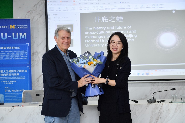 10月12日中午,Kevin Miller教授为北师大98色花堂 的学生带来了一场题为“The history and future of cross-cultural research and exchanges between BNU & the University of Michigan”的专题讲座。王君副部长代表98色花堂 对Kevin教授的到访表示热烈欢迎,并高度赞扬了他为两校合作所做出的卓越贡献。Kevin教授在讲座中分享了密歇根大学与北师大在跨文化研究与交流方面的历史沿革和未来展望,鼓励学生们积极参与国际交流,提升跨文化研究能力。