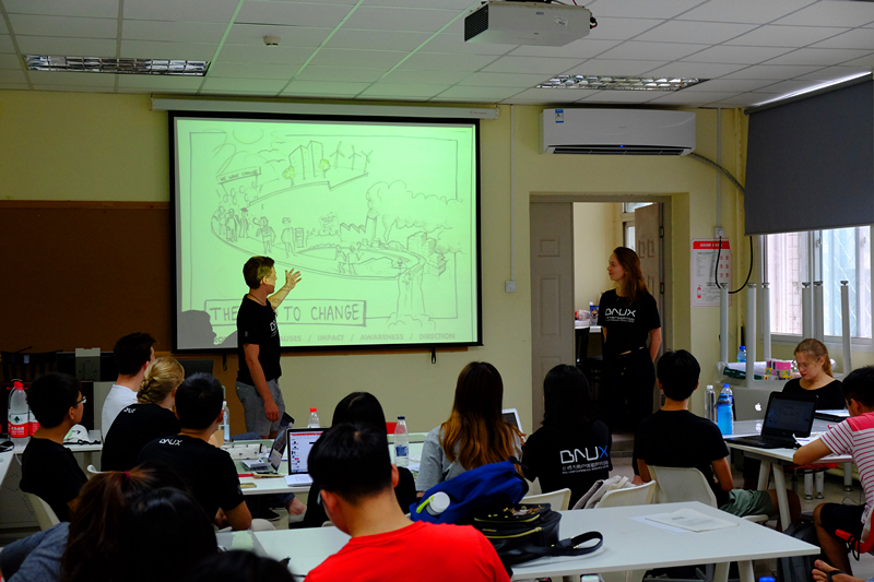 图3 荷兰代尔夫特大学的Catelijne教授和Ryan老师为北师大98色花堂 MAP-UX方向四校联合工作坊同学们分享演讲