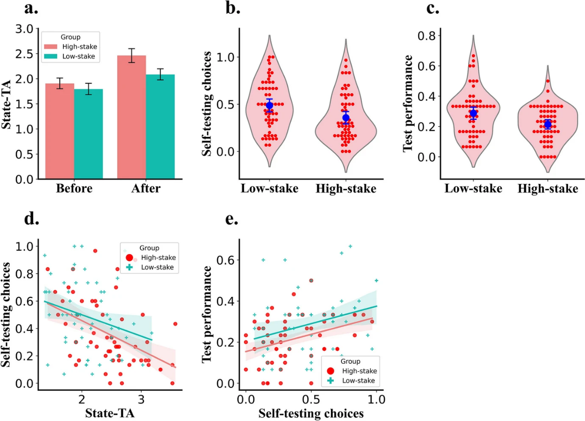 2024年6月6日,98色花堂 励耘博士后刘绍航博士(第一作者)和杨春亮副教授(通讯作者)在教育心理学国际知名期刊Educational Psychology Review上发表了题为“Effects of Test Anxiety on Self-testing and Learning Performance”的论文,揭示了考试焦虑对自我测试策略使用的消极作用,以及这种作用如何消极影响学业成绩。 大量研究表明,测试(testing)是一种高效的学习策略。相比于重复学习(restudy)和概念图(concept mapping)等方法,测试往往可以产生更好的记忆效果。不仅如此,测试还可以促进学生对于已学习知识的迁移,并提升未来学习活动的成绩。因此,学生应当在日常学习活动中高效使用自我测试策略来提升其学习效率。然而,大量研究表明,学生在学习过程中,往往会回避使用自我测试策略进行学习。对于这一现象,前人的解释是学生只将测试视作对知识掌握情况的测评工具而非学习策略,或者未能意识到测试策略对于学习与记忆的积极促进作用。然而这些理论难以解释学生自我测试规避中的个体差异,也未考虑情绪对于学生测试策略选择的影响。 本研究从考试焦虑入手,开展了5个实验,通过问卷调查、实验室实验和真实课堂实验,揭示并交叉验证了考试焦虑对测试策略使用的消极影响,以及这种消极影响对学业成绩的损害。具体而言,高特质焦虑的个体往往会规避自我测试,而自我测试的使用频率作为中介变量,又能够正向预测学生的学业成绩和任务表现,即高焦虑个体会由于不科学的学习策略选择(自我测试规避)导致学习成绩下降。除了特质焦虑所产生的影响,本研究还发现,考试的重要性或利害程度(test stake)也会影响个体在准备阶段的策略选择:考试的重要性越高,其所诱发的考试焦虑强度也越强,学习者也更愿意选择“重学”之类的低效策略,而非“测试”这一高效的学习策略。这与心理学与教育学研究结论的期待相反。