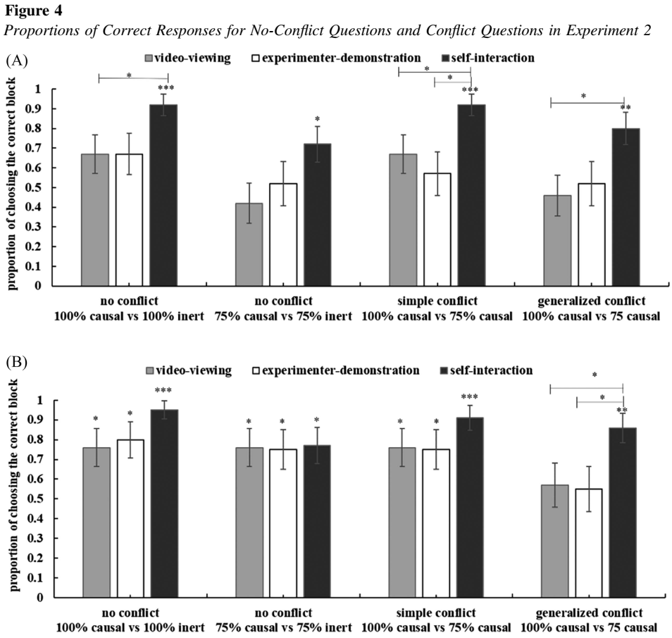 进入数字时代后,儿童的学习环境发生了深刻变化。触屏设备已广泛进入家庭与教育场景,并呈现出接触年龄不断提前的趋势,低幼儿童频繁使用触屏媒体已成为当下教育实践中难以回避的现实。这一变化引发了家长和教育工作者对其是否会给儿童认知发展带来负面影响的关注与担忧。然而,任何新的教育手段的出现都具有时代必然性,在不可逆的技术变迁面前,简单的否定或回避并非长远之策。更为关键的是,如何强化智能工具那些有助于儿童学习和发展的特征,从而实现对智能时代的理性回应与主动适应。 围绕这一问题,陈英和课题组于2025年11月在中科院Top期刊Developmental Psychology 在线发表了题为The impact of interactivity of touchscreen technology on 4- and 5-year-old children’s causal learning and transfer的论文,该研究聚焦于触屏设备的交互性特征,探讨这一特征是否能支持儿童形成更好的因果理解,并将所学知识迁移到现实世界。 研究共包含 3 个实验,393 名 4岁和5岁儿童参与。研究者将儿童随机分配到三种学习条件之一,自我交互条件:儿童亲自操作平板电脑屏幕上的任务,体验因果事件;实验者示范条件:儿童观看实验者在屏幕上演示因果关系,但自己不参与操作;视频观看条件:儿童观看完整呈现因果事件的视频,但既无自己操作也无他人操作。所有儿童需要学习一个新的因果系统,并根据学习到的信息推断原因与其产生的事件效果之间的因果关系。 在实验 1(n = 121)和实验 2(n = 133)中,研究重点考察儿童是否能够识别 100% 与 75% 的因果特征,以及在两种因果特征同时出现的冲突任务中,能否区分出 100% 特征是更可能的原因。结果显示:对 4 岁儿童而言,与实验者示范和视频观看两个条件相比,触屏交互更有助于识别100%和75%因果特征,以及在冲突任务中选择最可能的因果特征;对 5 岁儿童而言,三种学习条件下都能识别100%和75%因果特征,但在触屏交互条件下,在冲突任务中表现出明显优势。