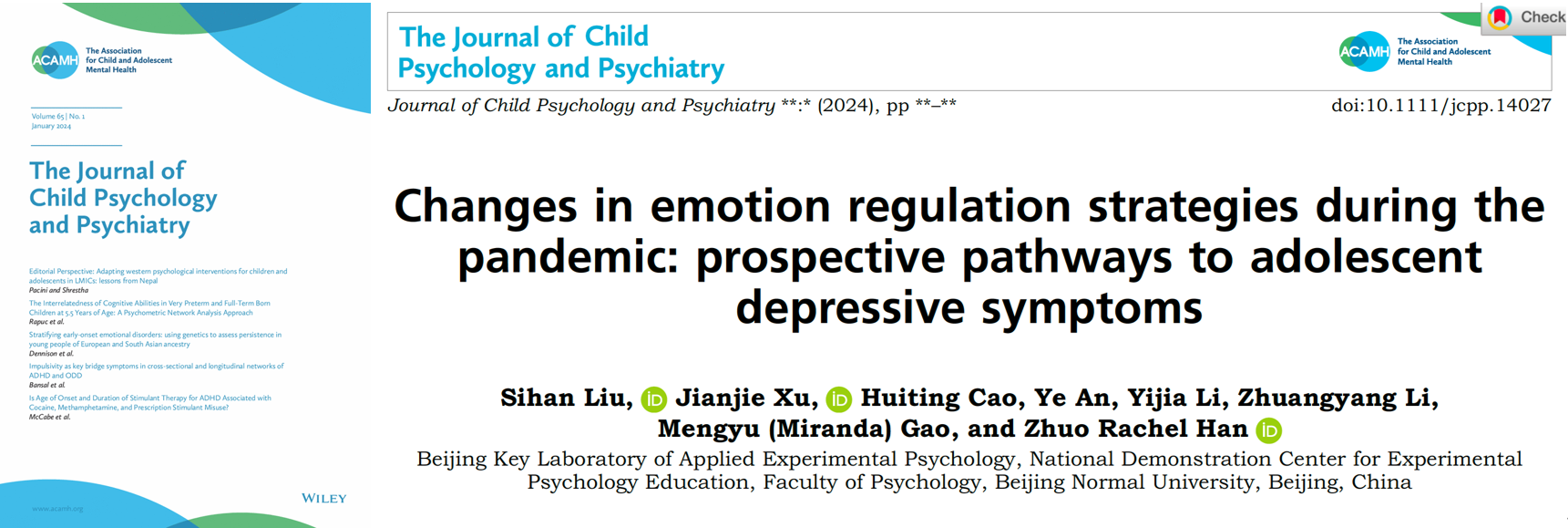 论文信息: Liu, S., Xu, J., Cao, H., An, Y., Li, Y., Li, Z., Gao, M. M.*, & Han, Z. R.* (2024). Changes in emotion regulation strategies during the pandemic: Prospective pathways to adolescent depressive symptoms. Journal of Child Psychology and Psychiatry. //doi.org/10.1111/jcpp.14027 |