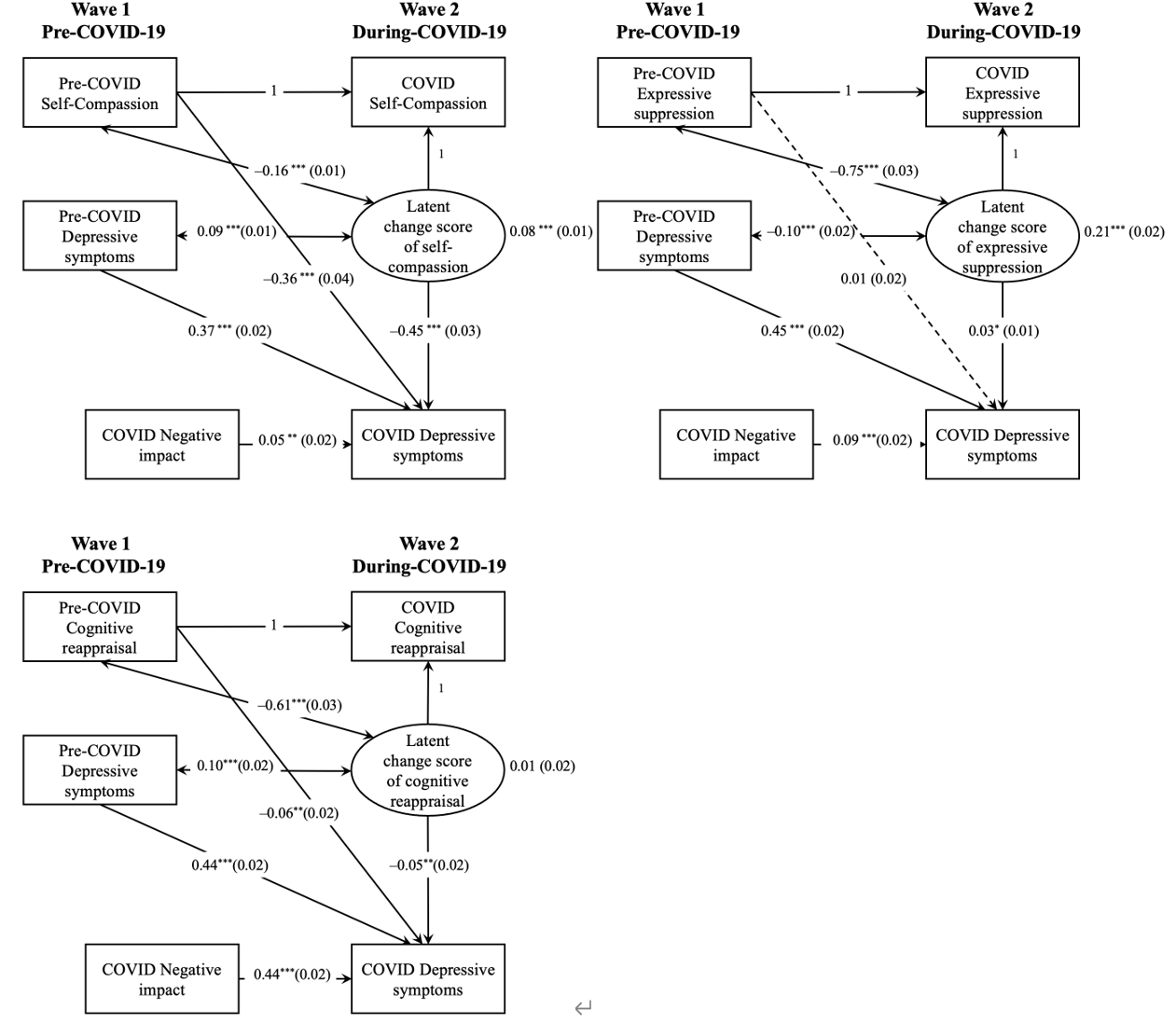 通过对2411名青少年(58.6%为女性,平均年龄18.51岁)在疫情前和疫情中的情绪调节策略(认知重评、表达抑制、自我关怀)以及抑郁症状进行追踪调查,本研究发现,青少年在疫情期间使用表达抑制和自我同情的情绪调节策略均有所增加。其中,表达抑制的增加预测了抑郁症状的增加,而自我同情的增加预测了抑郁症状的减少。此外,尽管整体上青少年使用认知重评的水平没有显著变化,但存在显著的个体差异——认知重评的增加(而非减少)预测了较少的抑郁症状。通过对三种情绪调节策略的预测效应进行比较,自我同情的效应最大。这一结果说明了在疫情这一缺乏人际互动和支持的时期,更倾向于关爱自我的个体,应对这一挑战也更自如。本研究说明了情绪调节策略的变化性,且这一变化与个体的心理健康息息相关。