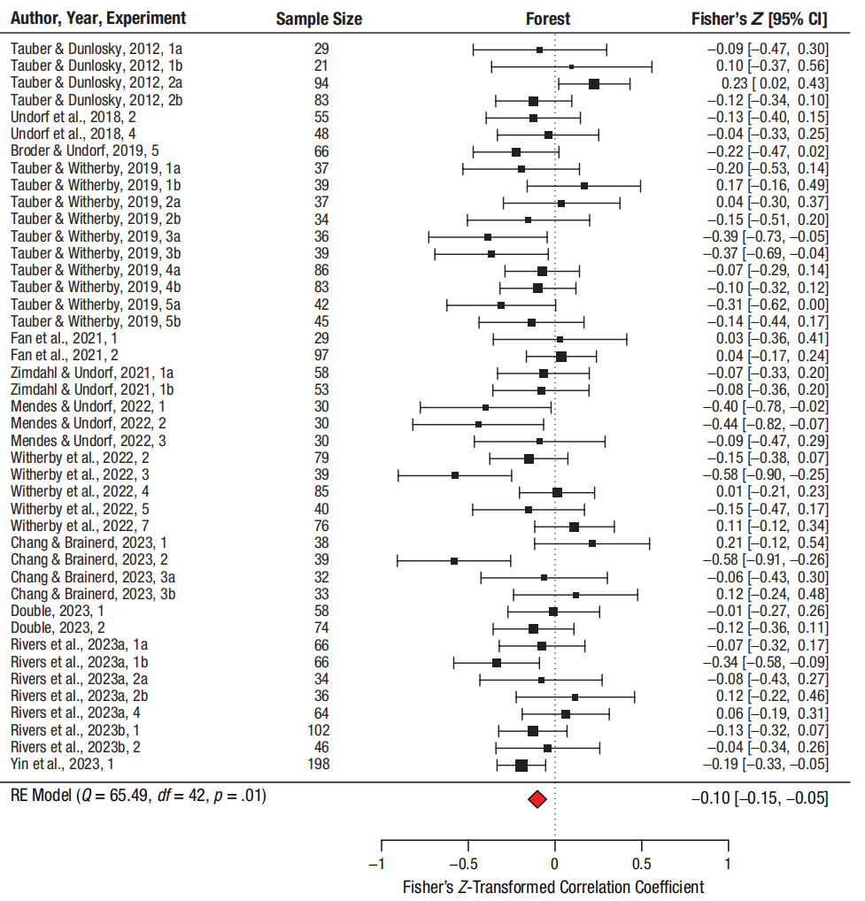 、发展心理研究院杨春亮教授课题组的最新研究却颠覆了这一长期以来的直觉假设。研究发现,学习能力与监测准确性之间并非正相关,而是存在一个出人意料的负相关关系:学习成绩越高的人,其对学习过程的监测反而越不准确。该成果以Good Learners Are Poor Monitors: A Negative Relation Between Learning Ability and Monitoring Accuracy为题,发表于国际实验心理学顶刊Psychological Science。 在元认知研究中,监测准确性通常通过学习者的“判断—回忆一致性”来衡量,也就是他们预测自己能否记住一条信息,与最终是否真正记住之间的吻合程度。这种预测被称为学习判断(judgments of learning,JOL)。过去不少研究者认为,学习成绩更好的人也会有更高的监测准确性,但这种结论往往依赖于再认测验(例如选择题)和“绝对准确性”指标(JOL平均值与成绩差距的大小)。问题在于,这些方法容易受到猜测和总体成绩差异的干扰,从而制造出一种“好学者更会监测”的统计学假象。相比之下,本研究聚焦于自由回忆测验,并采用“相对准确性”来衡量监测能力。它反映的是学习者能否在多个项目之间区分哪些真正学会了、哪些还没有。通过这一更严谨的指标,研究团队系统检验了学习能力与监测准确性之间的真实关系。 在研究设计上,本研究搭建了“现象验证—机制检验—稳健性复现”的证据链。首先,基于13项独立研究、43个效应量、覆盖逾两千名被试的元分析表明,学习成绩与监测分辨率之间存在小而稳定的负相关,且对材料类型、测验形式、年龄等潜在调节因素均表现出稳健性。