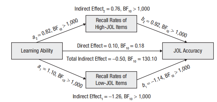 在此基础上,研究提出了“专家低自信假设(expert underconfidence)”来解释这一现象。对于学习能力较强的个体而言,当他们成功回忆起那些原本给予高学习判断值的项目时,判断与结果之间的吻合度会有所提高;但如果他们在测试中回忆起了原本判断为“记不住”的项目,这类“低JOL却被记住”的情况反而会削弱整体的一致性。相比之下,后者的负面影响更为显著,因此在总体上造成了学习能力与监测准确性之间的负相关。实验结果表明,这一双路径并行中介在分离学习与判断任务的实验中得到验证(实验3),并在采用连续量表和大样本(n = 481)预注册的研究(实验4)中再次被重现。