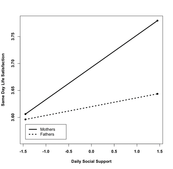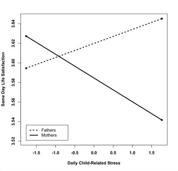 结果表明,日常体验到的与儿童相关的压力(A因素)与父母当天的生活满意度呈负相关,且这一关系仅在母亲中显著。类似地,日常体验到的社会支持(B因素)也仅与母亲当天的生活满意度相关。