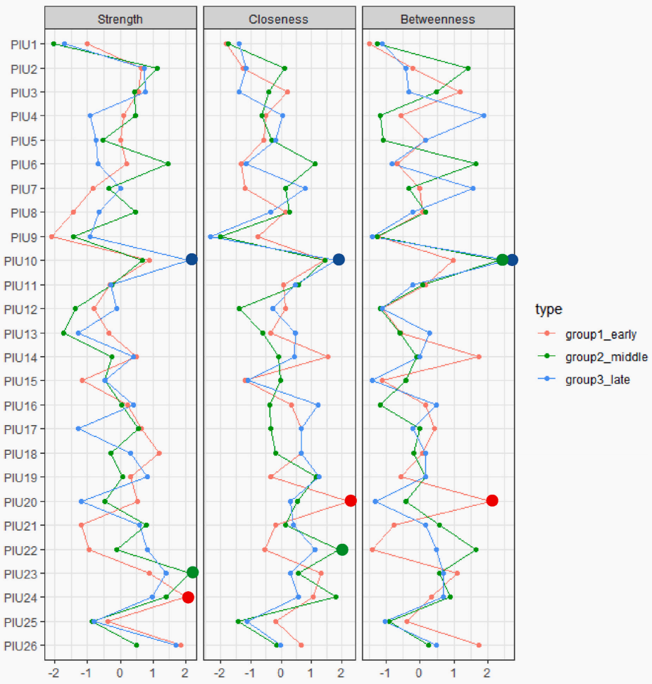 图2 青少年早、中、晚期问题性网络使用的核心症状 上述研究结果,一方面揭示了青少年问题性网络使用的症状网络结构及核心症状表现,为临床干预提供了实证依据;另一方面,这一结果也说明青少年不同阶段(早、中、晚期)在问题性网络使用的特点有所不同,需要制定不同重点的临床干预方案。