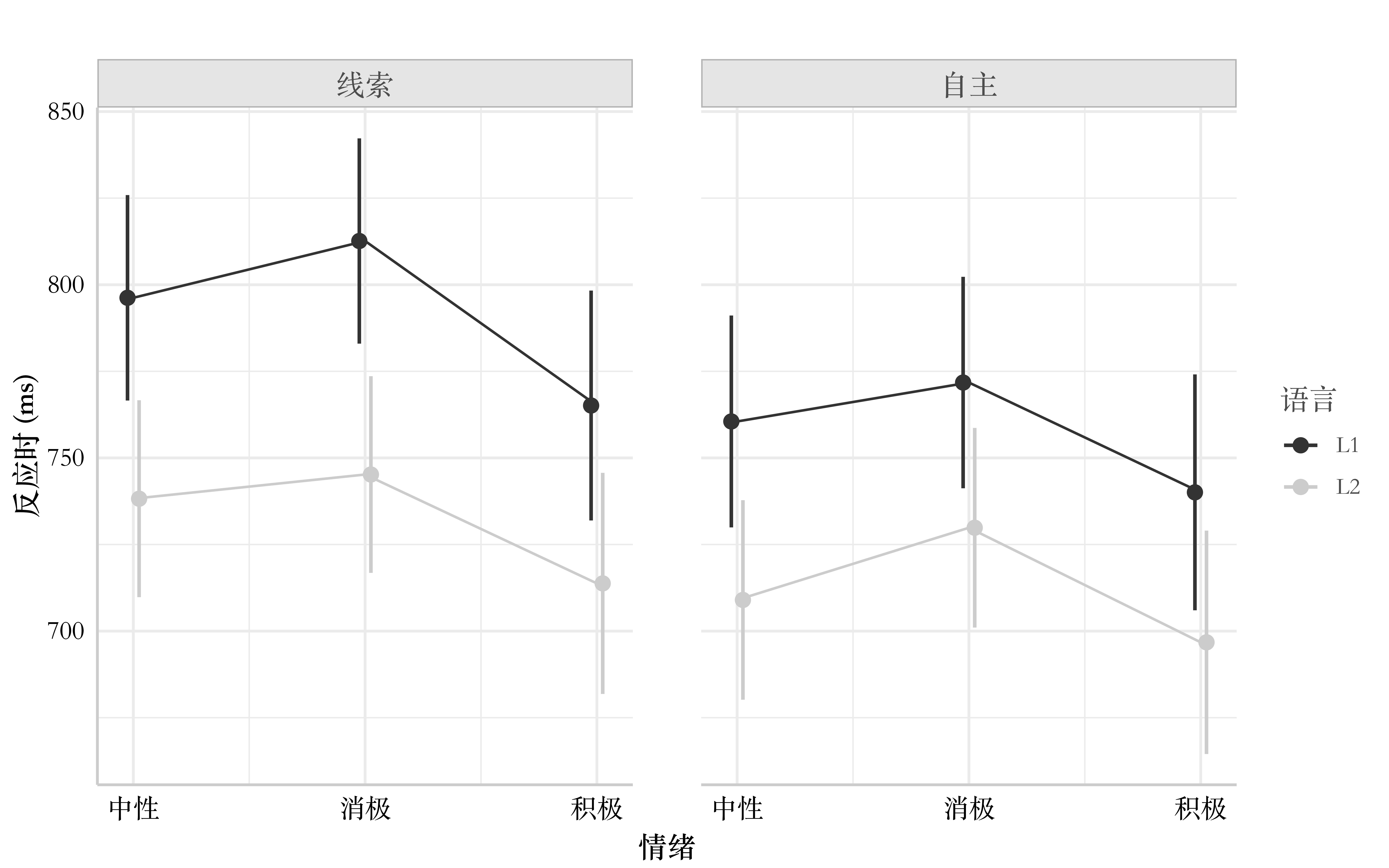 图1 线索和自主语言转换中,每种情绪条件下L1和L2试次上的反应时 注:L2试次相对于L1试次的反应时优势反映了双语者对L1施加主动性的控制,从而降低L1对L2的干扰,提高总体的任务表现。