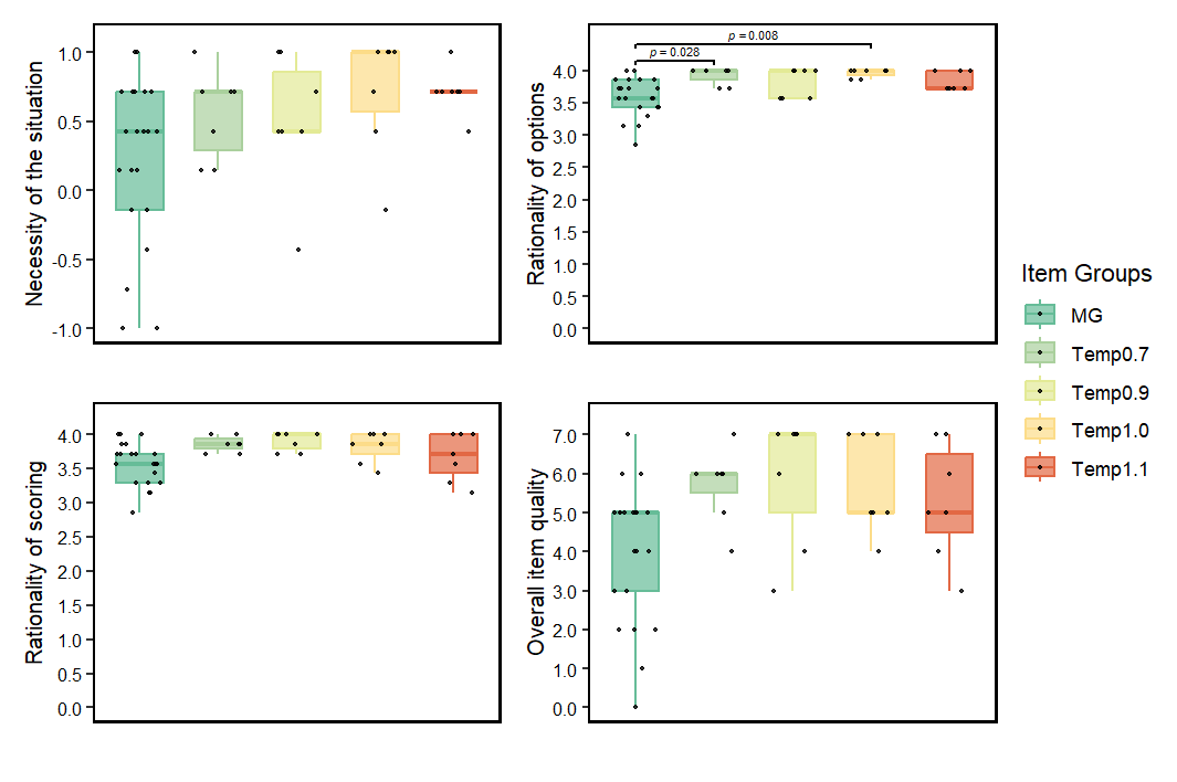 该研究首先聚焦于技术参数与提示词策略的优化,发现通过设置合理的温度参数(如 Temperature = 1.0)并采用经过多轮迭代优化的结构化提示词,GPT-4能在创造力与准确性之间达到最佳平衡,并生成语义丰富、逻辑严密的测试情境。这一优化过程不仅保证了题目情境的多样性,更有效规避了以往研究在生成复杂情境题目时容易出现的评分逻辑错误,显著提升了生成题目的内容效度。