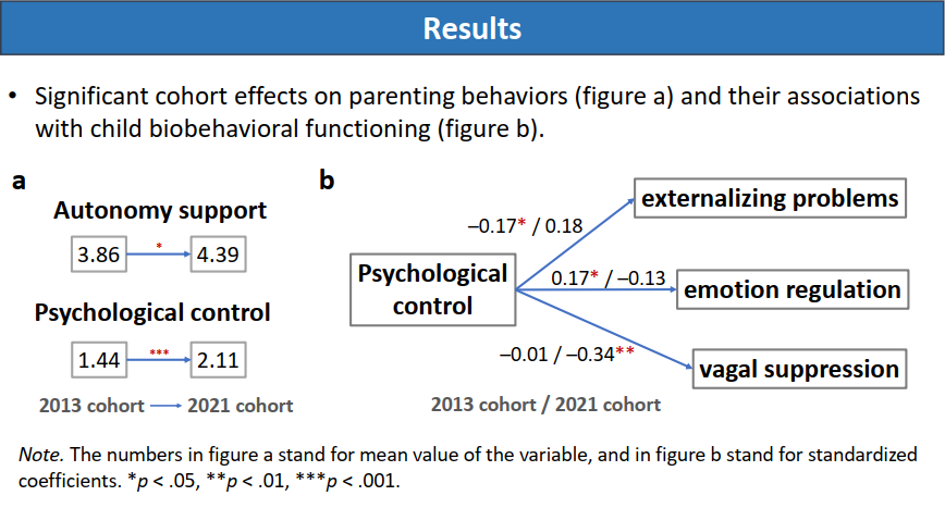 图1 父母教养方式及其对儿童情绪能力影响的时代效应 论文信息: Xu, J., Chen, X., Liu, S., Weng, X., Zhang, H., Yi, Z., Gao, M., Han, Z. R.* (2024). Parental autonomy support and psychological control and children’s biobehavioral functioning: Historical cohort differences in urban China. Child Development, Advance online publication. //doi.org/10.1111/cdev.14145 |