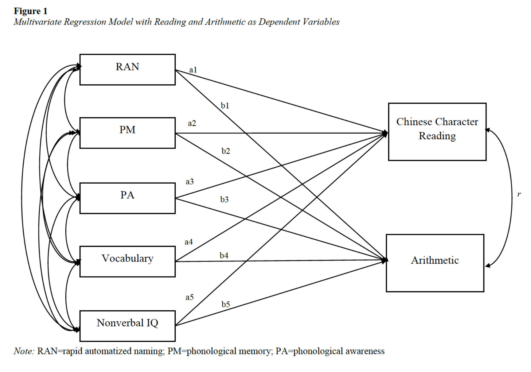 图1 快速自动命名、语音记忆、语音意识、词汇知识和非言语智力对阅读和计算的回归模型。