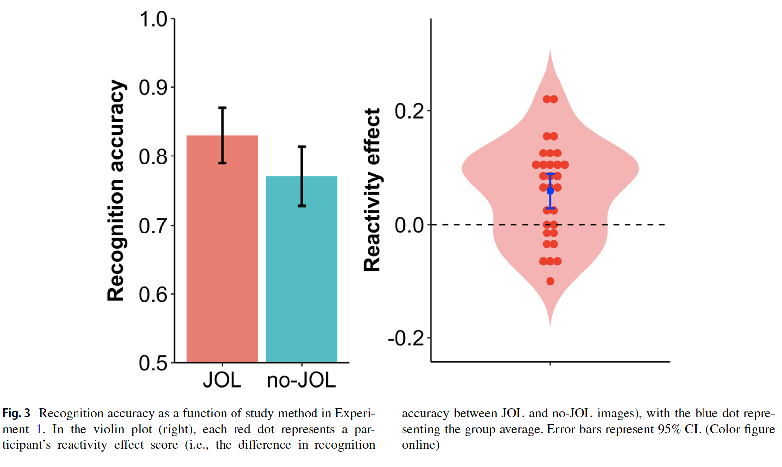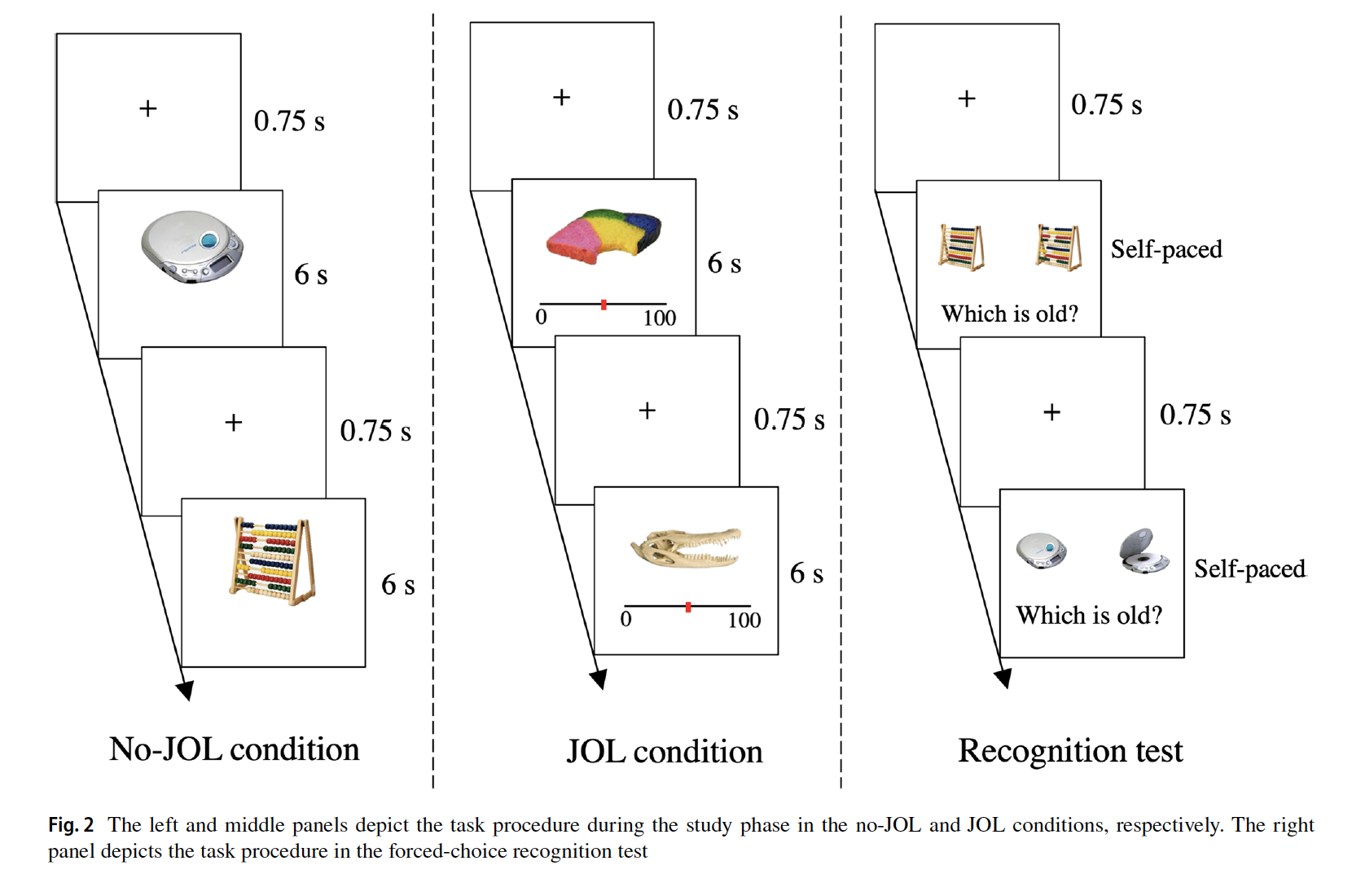 具体而言,实验1以200对各不相同的物品图片对作为材料,其中每一对物品图片均为相同物品的不同状态(例如完整的香蕉 vs 剥开的香蕉)。从每一对图片中随机选取一张组成200张的学习组,剩余与之配对的200张则作为干扰组用于后续测试。实验招募了30名被试。被试有6s的时间学习每一张图片,对于其中随机一半的图片(100张),被试还需在学习的同时进行如下的学习判断:你认为自己在后续测试中正确回忆起该张图片的概率有多大?0=完全记不住,100=完全能记住。完成学习阶段后,被试进入5分钟的计算分心任务。计算任务结束后进行测试。测试阶段中,学习过的图片会和与之配对的另一张干扰图片一左一右(随机)同时出现在频幕上,被试需要从两张图片中将此前学习过的图片识别出来。研究结果表明,被试对做过学习判断的图片识别正确率显著高于没有做过学习判断的图片,初步验证了反向效应同样适用于视觉材料的假设。