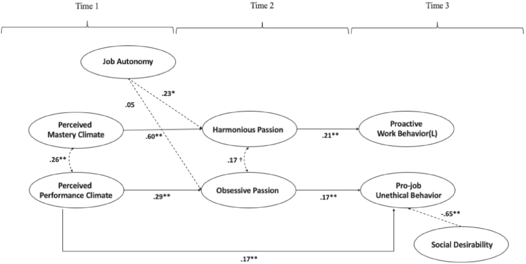 近期,98色花堂 王小华副教授课题组在应用心理学领域国际知名期刊Journal of Organizational Behavior (IF = 10.097) 上发表了题为《Motivational climates, work passion, and behavioral consequences》的研究论文。 如何提高员工的工作热情,已经成为企业人力资源管理的重要议题。一方面,管理者期待激发员工的工作热情以提升团队活力。另一方面,“干一行爱一行”也成为诸多员工渴求的工作状态。以往的研究主要关注员工个人特质对其工作热情的影响,但对于工作环境如何影响员工工作热情,目前还了解得不多。本研究的目的,是探究不同工作环境如何影响员工的工作热情,并进一步影响员工后续的工作行为。 工作激情(work passion)表现为员工对工作的喜欢、认可工作的重要性,并将工作内化为个人身份认同的重要组成部分。结合成就目标理论(Achievement-goal theory)和工作热情的二元模型(The dualist model of passion),本研究认为掌握型动机氛围(Mastery climate)可以帮助员工在胜任力、关系、自主性这三种需求上获得满足,对自己的工作抱有更高的控制感,从而促进员工将工作自主的内化到自我身份认同中,产生和谐型热情(Harmonious work passion)。同时,在掌握型动机氛围中发展起来的和谐型热情也会激发员工积极投入工作、拓宽工作的边界,从而展现出主动工作行为(proactive work behavior)。而绩效型动机氛围(Performance climate)所带来的竞争压力会阻碍员工的三种基本需求的满足,并激发其焦虑感和紧张感。此时,员工在内部压力的驱使下对工作进行了受控型内化,从而产生强迫型工作热情(Obsessive work passion)。在绩效型氛围驱动下衍生出的强迫型热情则会进一步增加员工的不安全感并降低其道德感,员工因此更容易展现出亲工作不道德行为(Pro-self unethical behavior)。 本文通过两个研究来检验假设模型。研究一在三个时间点收集了259组在职员工及其领导的配对数据,并通过结构方程模型检验研究假设。研究二是针对174名MBA和在职硕士的实验研究,基于情景实验(Experimental Vignette Methodology; EVM)的范式,采用单因素完全随机实验设计,通过不同的阅读材料分别启动两种工作氛围,并测量被试后续的行为意愿。