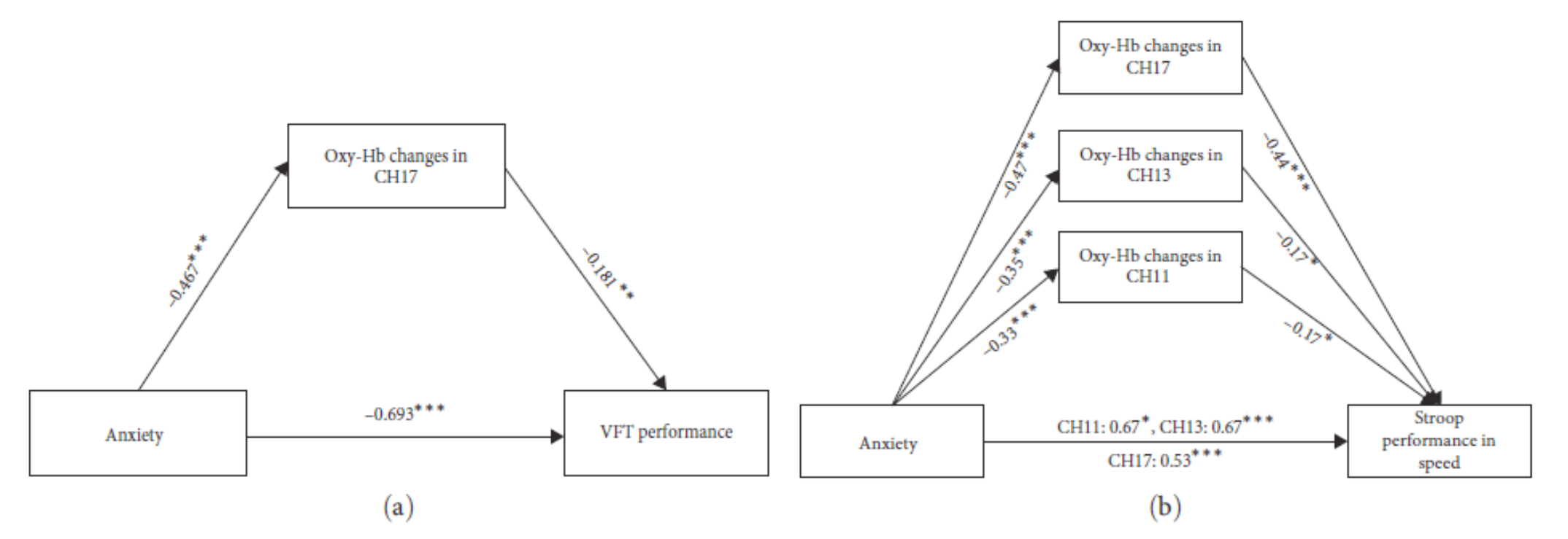 研究发现与健康对照组(HCs)相比,焦虑组在前额叶皮层(PFC)通道中的皮层激活减少,在Stroop任务中表现出较长的抑制反应时间和较低的抑制准确性,以及在言语流畅性任务(VFT)中的表现下降。研究观察到SAS评分与抑制能力及前额叶皮层激活之间存在显著的负相关性。相反,前额叶皮层激活与抑制能力之间表现出正相关性。此外,在言语流畅性任务期间,背外侧前额叶皮层的激活在焦虑情绪与抑制表现之间的关联中起到了部分中介作用。