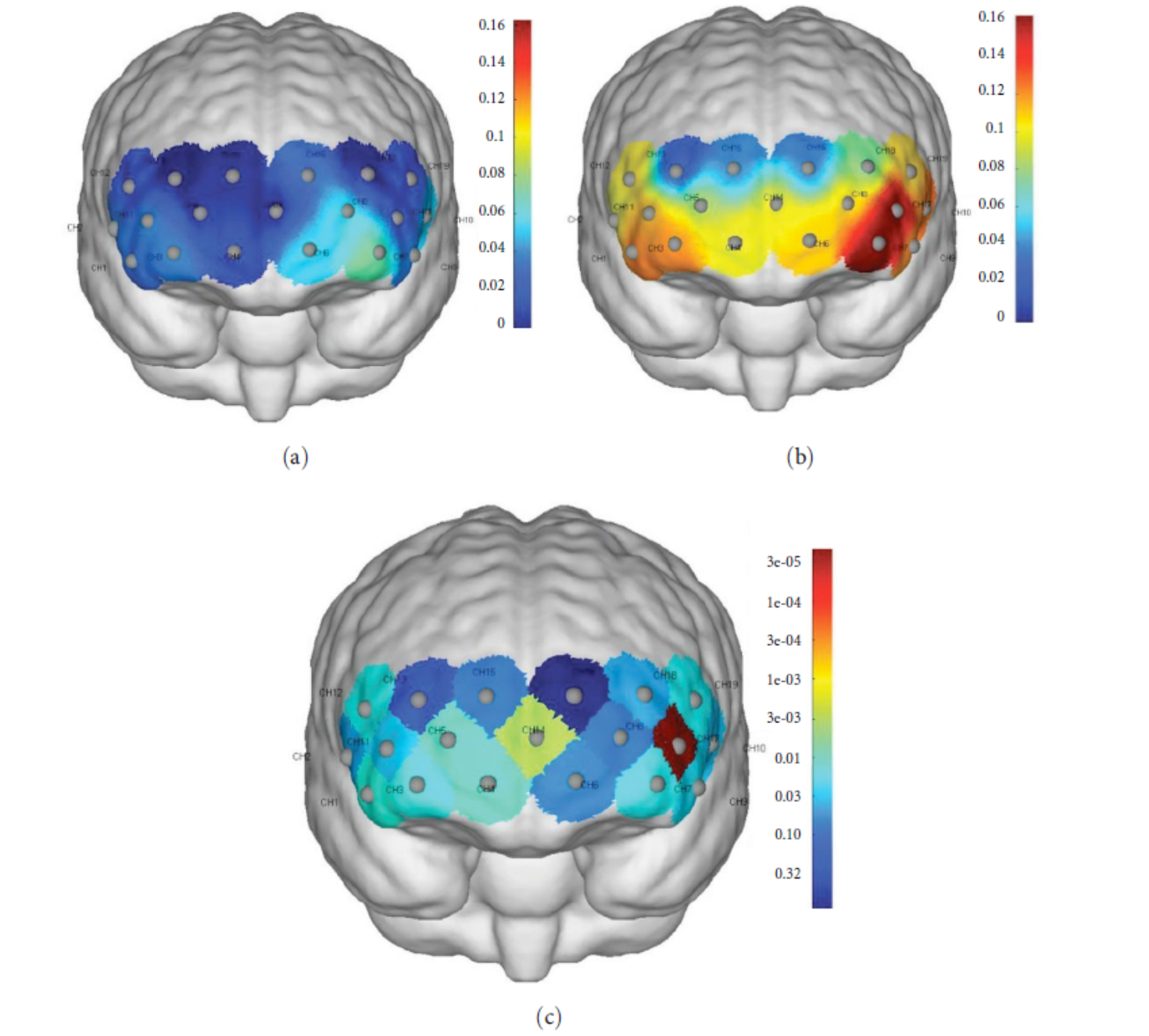 图1 (a) 焦虑障碍患者组 VFT 期间平均 Oxy-Hb 变化。 (b) 健康对照组VFT 期间平均 Oxy-Hb 变化。(c) 焦虑障碍患者与健康对照组相比每个通道激活的p值。