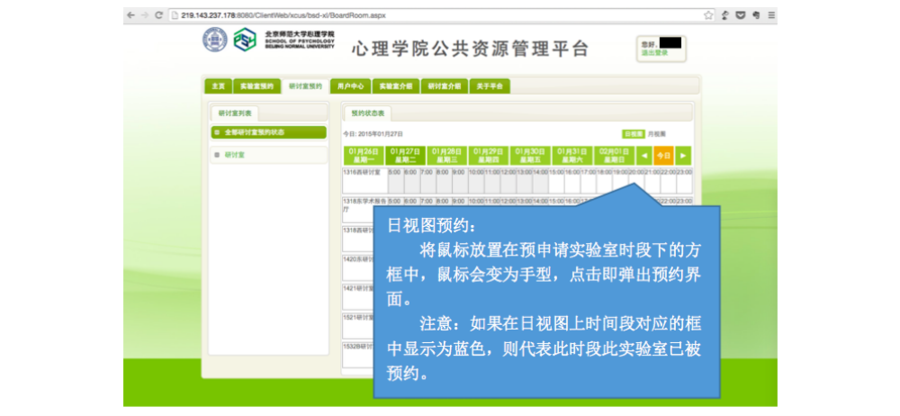 审核完成后,申请人和加入系统的相关人员就可以在相应时段打开研讨室房间来了。 三、临时有事,研讨取消?查看和退订研讨室啦~ 说明:基于研讨室管理规定,约了研讨室迟到或者不来,是需要扣除相应积分的,因此,如果临时有事迟到或取消研讨,一定要在预约系统更改预约信息,避免不必要的损失。 进入用户中心: