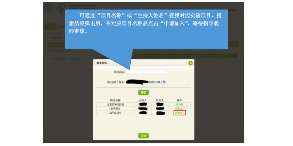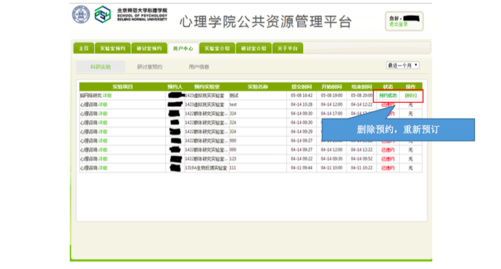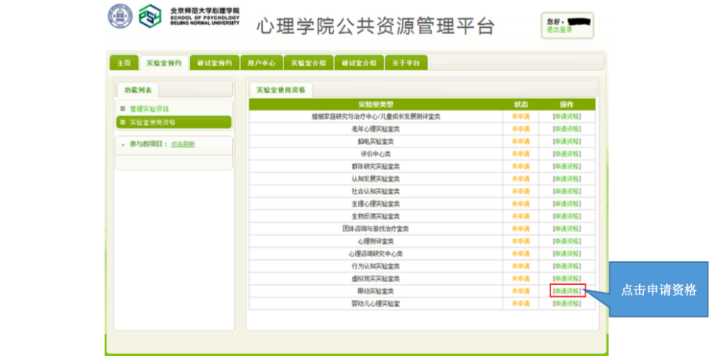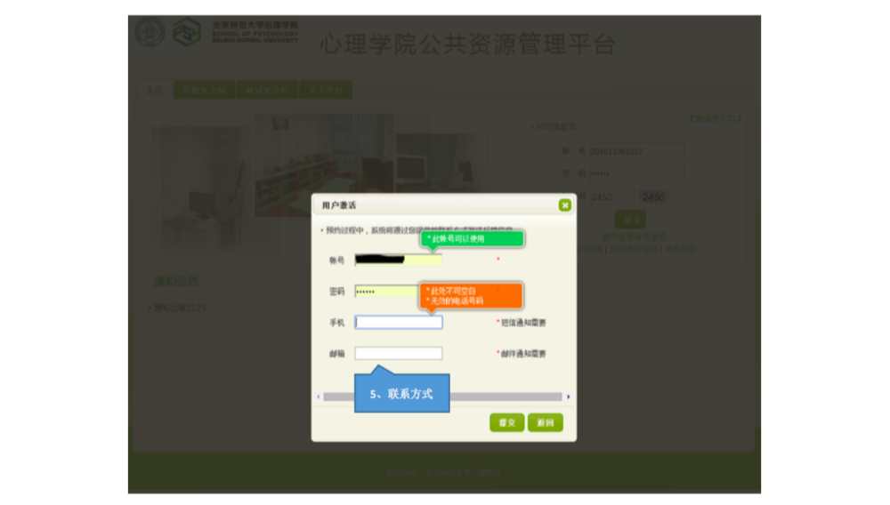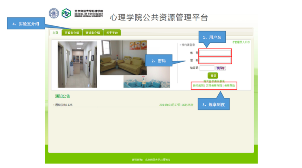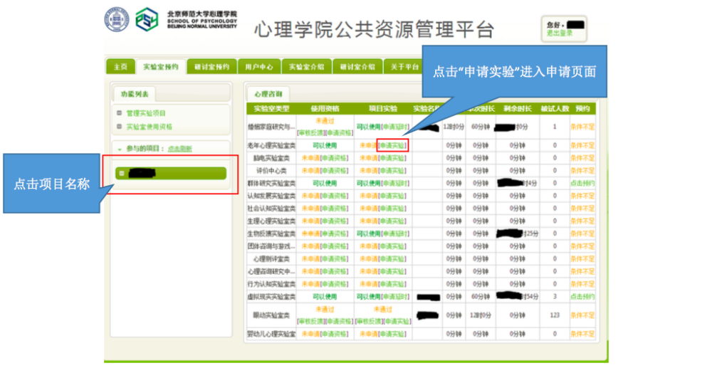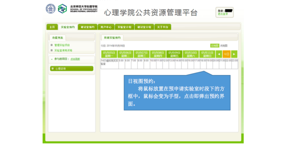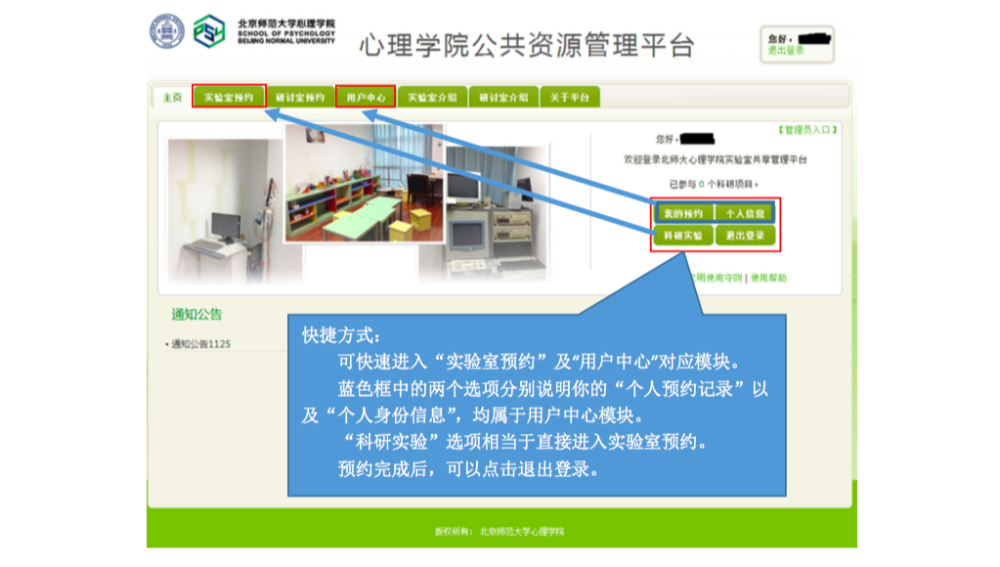 一、 IE 登录“心理学院公共资源管理平台”,激活账号: A. 网址://219.143.237.178:8080/ClientWeb/xcus/bsd-xl/Default.aspx B. 登录的用户名(1)为“学号/工作证号”,密码(2)为“一卡通查询密码”。(一台 机器只能同时登陆一个账号) C. 使用前请认真阅读《预约规则》、《实验室文明使用守则》(3) D. 可以通过“实验室介绍”了解各实验室的配置条件,找到满足需要的实验室。 E. 新用户首次登陆时,需要激活。请在激活界面填写自己的手机号和邮箱(5)。 F. 进入主页,开始准备实验室预约。“实验室预约”和“用户中心”最为常用。 二、 进入“实验室预约”界面,申请加入实验项目: 说明:按照实验室使用规定,所有学生预申请使用实验室,都需要经过指导教师同意, 并在预约系统中申请加入指导教师所设立的实验项目(即包括科研项目、也包括教学项目)。 指导教师通过自己的账号将你加入项目或者审核通过了你的申请之后,你才有资格以所申请实验项目的名义提交实验室预约申请。 三、 进入“实验室预约”界面,申请实验室使用资格: 说明:按照实验室使用规定,所有学生预申请使用实验室,都需证明自己经过专业训练,具有使用所申请实验室仪器设备的技能。因此,在申请使用实验室之前,需通过系统向实验室管理教师提出申请,证明自己的实验操作能力。申请一旦通过,终身有效,无需再次申请。 四、 进入“实验室预约”界面,申请开展本次实验资格: 说明:在取得项目资格和实验室使用资格之后,点击项目,进入实验申请页面。 此时,在使用资格一览中显示为“可以使用”的实验室即可申请实验项目。 五、 万事俱备、只欠东风,开始预约实验室啦~ 说明:当你爬山涉水,三项审核都通过了,那么你就可以轻松的预约实验室啦~ 进入界面之后,以日视图查看: 进入界面之后,以月视图查看: 注意:如果在日视图上时间段对应的框中显示为蓝色,则代表此时段此实验室已被预约。 这一步完成后,就相当于你申请的那间实验室在你申请的时段中归你所有了。 注意,并不是每次都需要重复所以以上项目,只要满足了以上三次审核,就可以申请 实验室,如果缺少一项或者两项,补上缺失的项即可。 六、 临时有事,实验取消?查看和退订实验室啦~ 说明:基于实验室管理规定,约了实验室迟到或者不来,是需要扣除相应积分的,因此, 如果临时有事迟到或取消实验,一定要在预约系统更改预约信息,避免不必要的损失。 进入用户中心: 综述:预约实验室需要满足三项许可, 之后即可自由预约。 (1) 项目资格,申请加入教师项目 (2) 使用资格,是否具有使用所申请实验室的技能 (3) 实验资格,申请的实验是否适合在该实验室进行 完成以上三步审核后,即可在规定时段内选择实验室啦~如果 不满足以上条件,缺哪个补哪个就可以啦~ |