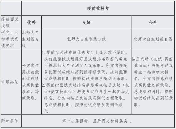 二、提前面试考核及录取办法 (一)考核内容: 包含笔试(200分)及面试(300分),笔试内容为综合能力测评以及心理健康素质测评。提前面试成绩中笔试成绩、面试成绩、提前面试总成绩分别需要达到100分、180分、300分视为提前面试成绩合格。提前面试成绩不合格考生不予录取,不参加排名。 (二)提前面试录取办法