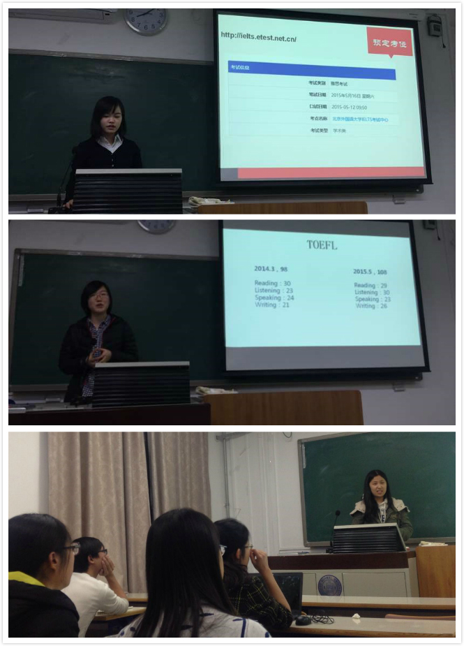 2015年12月5日晚,由心理学院分团委学习交流部主办的雅思、托福考试经验交流沙龙会顺利举办,本次交流会邀请到了心理学院2012级张乔茜、孙馨和张旭彤。 交流会上,张乔茜从推荐资料、考试题型等方面介绍了雅思考试相关内容。孙馨和张旭彤则向同学们推荐了托福备考书籍,分享了考试技巧与经验,并针对参考时间和考试报名提出建议。 本次活动让同学们对雅思、托福考试有了深入了解,熟悉了题型与答题技巧,充满自信地迎接考试。 (心理学院分团委学习交流部易尚文供稿,舒宇航供图) |