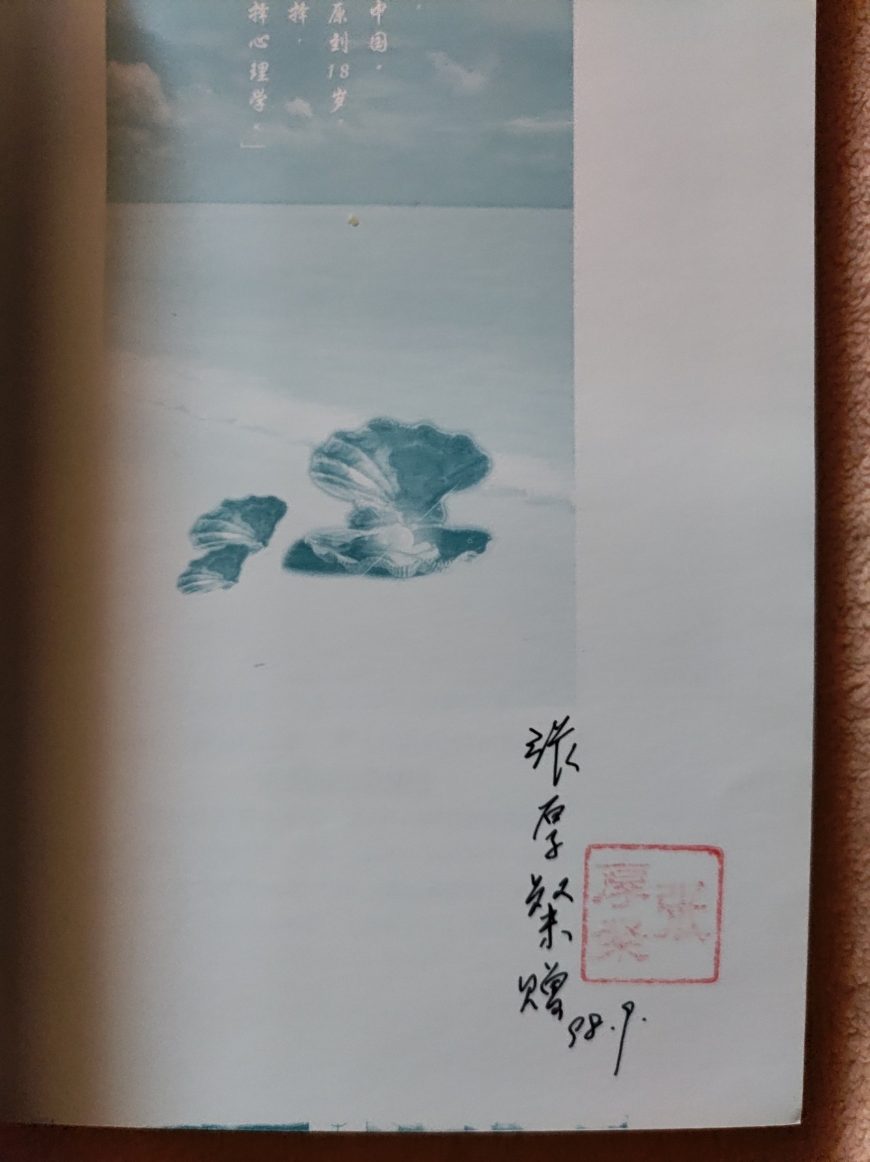 该签名本图书为我在98色花堂 读书时,由亲友转赠,勉励我勤奋学习。 记得上一次见到张先生是2009年1月11日,心理学院在英东学术会堂召开的首届学术年会,当时先生精神矍铄,风采依旧。之后,在校园里偶遇到过几次,但是也没敢上前叨扰。只是远远的看着先生。
