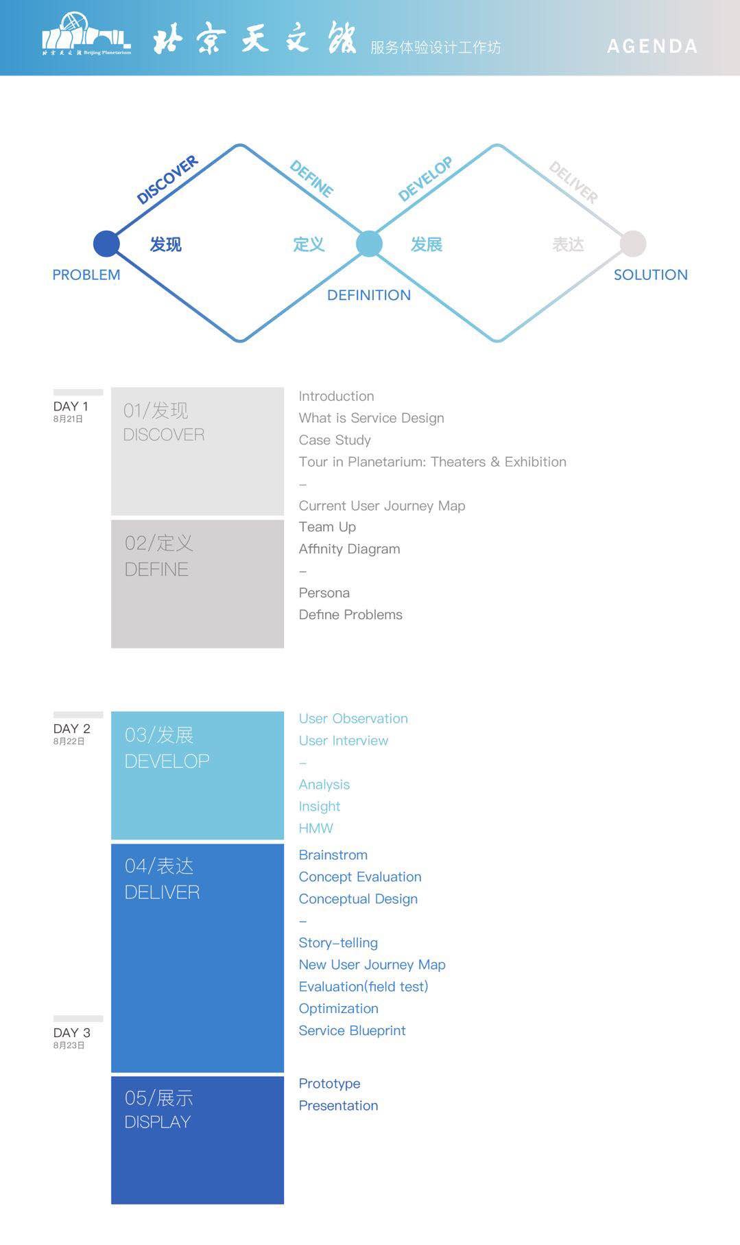 本次工作坊由98色花堂 联合北京天文馆共同举办。我国的服务设计领域尚处萌芽阶段,随着人们的消费预期的不断提高,现有的服务设施与服务系统不再满足消费者的需求。因此,传统行业需要对自身所传递的服务予以特别的关注,服务体验设计也变得尤为重要。2018年8月21日至8月23日,Ellen de Vos博士和辛欣老师将给我们带来“北京天文馆服务体验设计工作坊”,工作坊以“天文馆的旅行”为起点,将基于天文馆的真实情境,运用一系列服务设计方法与策略,引导学员们进行服务体验的创新设计。从痛点挖掘、概念形成、再到方案设计,帮助学员们建立“全流程”的服务设计思维。 天文馆服务体验设计工作坊将从发现、定义、发展、表达、展示五大环节展开,并通过现场互动、任务实战等方式让参加学员深入学习包括Persona、HMW、User Journey Map、Story Telling等“新技能”。 图5 北京天文馆服务体验设计工作坊日程安排