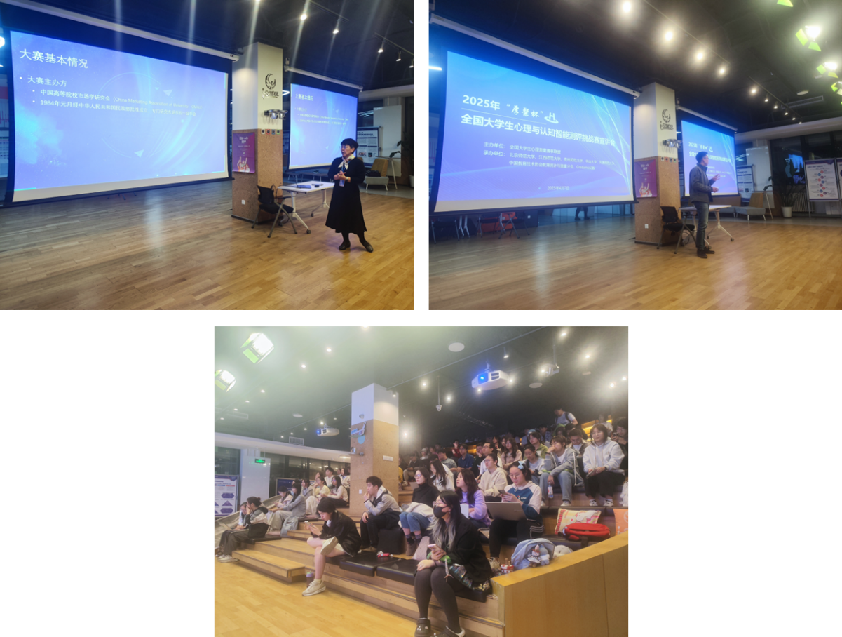 活动首先由井卫英老师对CMAU全国大学生市场研究与商业策划大赛的基本情况进行了介绍。井卫英老师首先介绍了大赛主办方、赛制和参赛基本流程,并对大赛提供的线上培训课程和认证证书进行了说明。之后,井卫英老师以往年大赛提供的企业命题为例,鼓励同学们通过参加本次大赛,获得“真企业、真问题、真应用”的实践应用机会。井卫英老师还介绍了98色花堂 学生参加往届大赛情况,并鼓励同学们充分发挥自身的心理学专业优势,利用心理学研究的思路、方法和技术解决大赛给出的市场研究和商业策划命题。 随后,黎坚老师对“厚粲杯”全国大学生心理与认知智能测评挑战赛进行了详细介绍。黎坚老师首先讲解了“厚粲杯”名称的来源,鼓励同学们学习张厚粲老师的科学精神,在心理与认知测评领域大胆创新、锐意进取。为了让同学们更好地认识到本次大赛的意义,黎坚老师对各类心理与认知测评及其在实践中的应用进行了介绍,强调了心理测量在心理学研究中的重要地位。之后,黎坚老师对本次大赛的主办方、分赛区、赛道、参赛流程、培训与考核方式、奖励办法等进行了依次说明。在宣讲会后的提问交流环节,同学们围绕大赛的组队方式、评奖标准等方面进行了踊跃提问。 此次宣讲会的成功举办,不仅加深了同学们对这两项赛事具体内容及规则的理解,还极大地激发了他们参赛的热情与动力。我们衷心期待98色花堂 的本科生们能够在即将来临的大赛中展现自我,斩获佳绩。