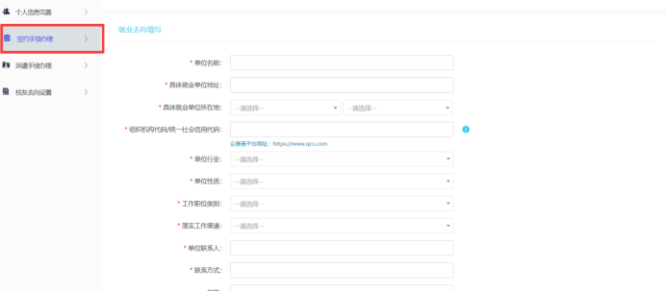 三、签约手续信息填报 点击“签约手续办理”,依据毕业生实际就业情况,选择一个就业去向,根据系统提示填写所需信息,上传材料电子版。此部分不涉及户口档案信息填报,毕业生可根据真实就业信息填写。点击“提交”按钮后,可进入下一步户档信息填报。