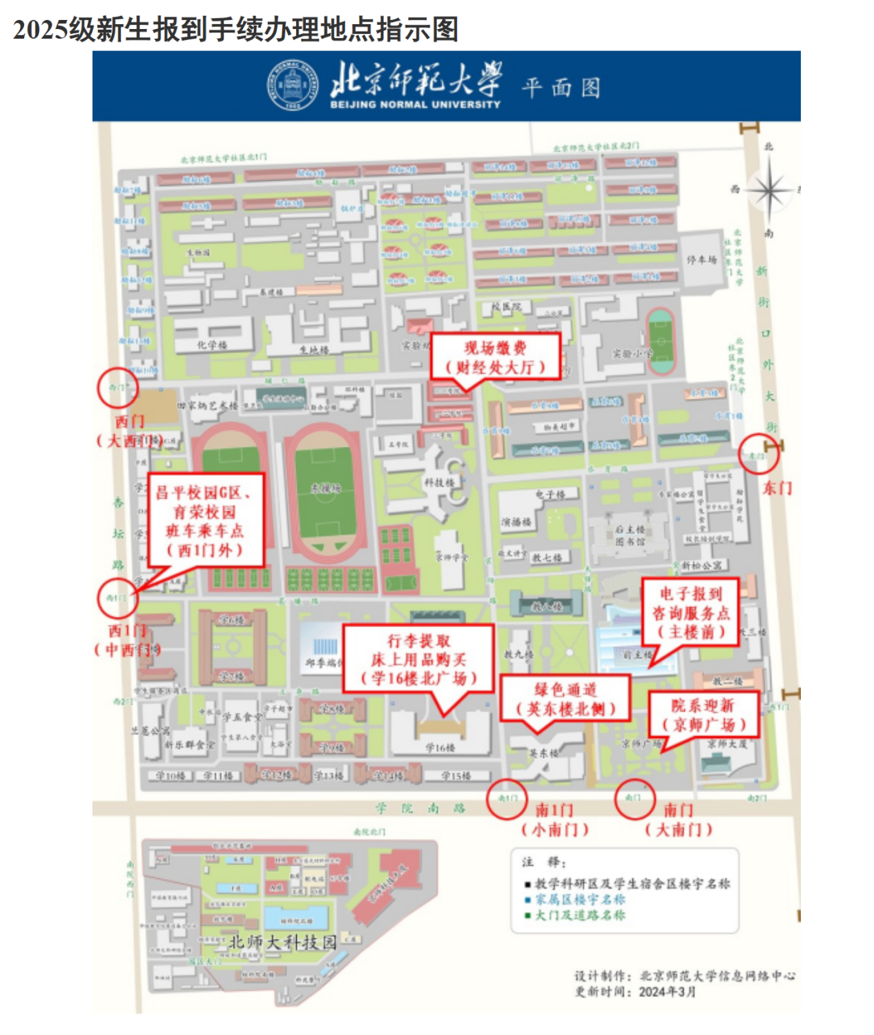 常见问题解答 Q1:如果录取通知书丢失怎么办? A1:带有效证件到主楼A区103补办相关证明。 Q2:未缴费成功该怎么办? A2:未缴费成功的新生于报到当天持录取通知书到财经处大厅现场交费。 Q3:行李如何提取? A3:9月14日7:00-17:00海淀校园学16楼北广场凭托运凭证及有效证件提取托运行李,也可在此订购卧具;昌平校园G区在海淀校园提取托运行李后,乘坐班车前往对应校园。 Q4:如何办理住宿? A4:9月14日7:00-20:00,海淀校园持录取通知书前往所在宿舍楼办理入住,昌平校园G区新生从海淀校园乘坐班车至昌平校园G区,持录取通知书前往所在宿舍楼办理入住。 Q5:新生“绿色通道”? A5:全日制家庭经济困难学生可在入学当天至绿色通道迎新处办理学宿费缓交、国家助学贷款,领取爱心助学物资等。 学宿费缓交申请通过“数字京师”-“办事大厅”-“学宿费缓交”平台提交; 爱心助学物资通过“学生工作管理系统”-“奖助管理”-“绿色通道”平台申请,审核通过后绿色通道补助发放至学生银行卡中,爱心大礼包至绿色通道迎新服务点领取。 办理时间:9月14日7:00-17:00 办理地点:海淀校园英东楼北侧