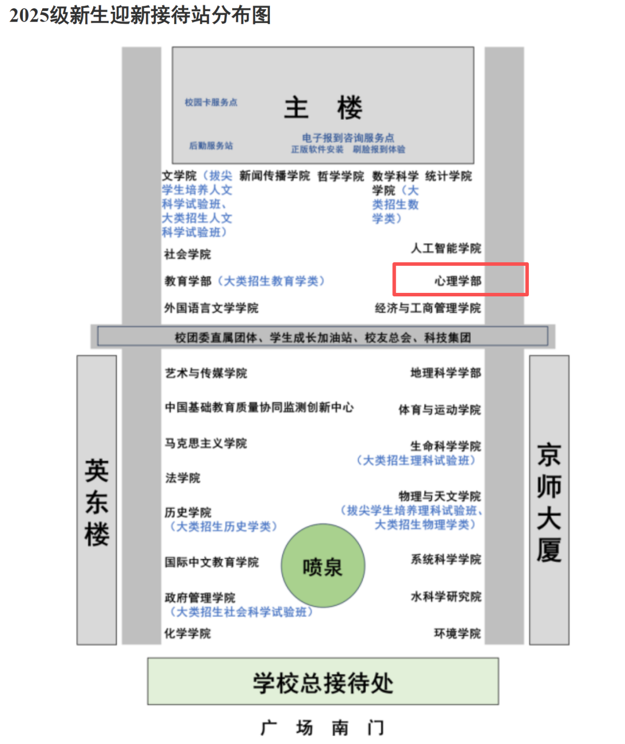 五、2025级新生班会 本科综合班和励耘班:9月14日周日17:30,地点:教四106; 本科师范班:9月14日周日17:30,地点:教四108; 本科心理+AI班:9月14日周日17:30,地点:教四110; 学硕1班:9月14日周日18:00,地点:教二201; 博士1班:9月15日周一10:30,地点:昌平校园,1号教学楼404教室; 博士2班:9月15日周一10:30,地点:昌平校园,1号教学楼401教室; 博士3班:9月15日周一10:00,地点:后主楼1420 (其他非全日制各班以班主任通知为准) 六、新生党团组织关系转入说明 点击链接查看://98shtvip.org/xwzx/tzgg/f9bd120501bb4ab68c976ebfa15ae2ba.htm 七、亲友入校及服务 1.新生可通过电脑端信息门户“//one.98shtvip.org-办事大厅”或手机“微信-通讯录-98色花堂 - 办事大厅”(需关注微信门户),为亲友预约9月14日、9月15日入校。预约成功后,新生亲友可持本人身份证或预约成功短信提醒入校。 2.9月14日7:00-17:00开放教七楼西侧敬文讲堂供新生亲友休息。 3.9月14日、15日8:30-17:00开放学校形象陈列馆(后主楼23层,后主楼东侧进,西侧出),学生和亲友可自行参观。 4. 餐饮服务中心为新生家长提供便利用餐服务: 学生第一食堂(新乐群一层)、学生第五食堂、学生第八食堂(民族风味)均开设新生家长套餐窗口,套餐20元/份(含两荤两素),支持校园卡、微信、支付宝支付,用餐时间为10:00-20:00; 教工第四食堂(兰蕙餐厅二层)提供种类丰富的自助餐,收费标准为35元/人,用餐时间:11:00-20:00。