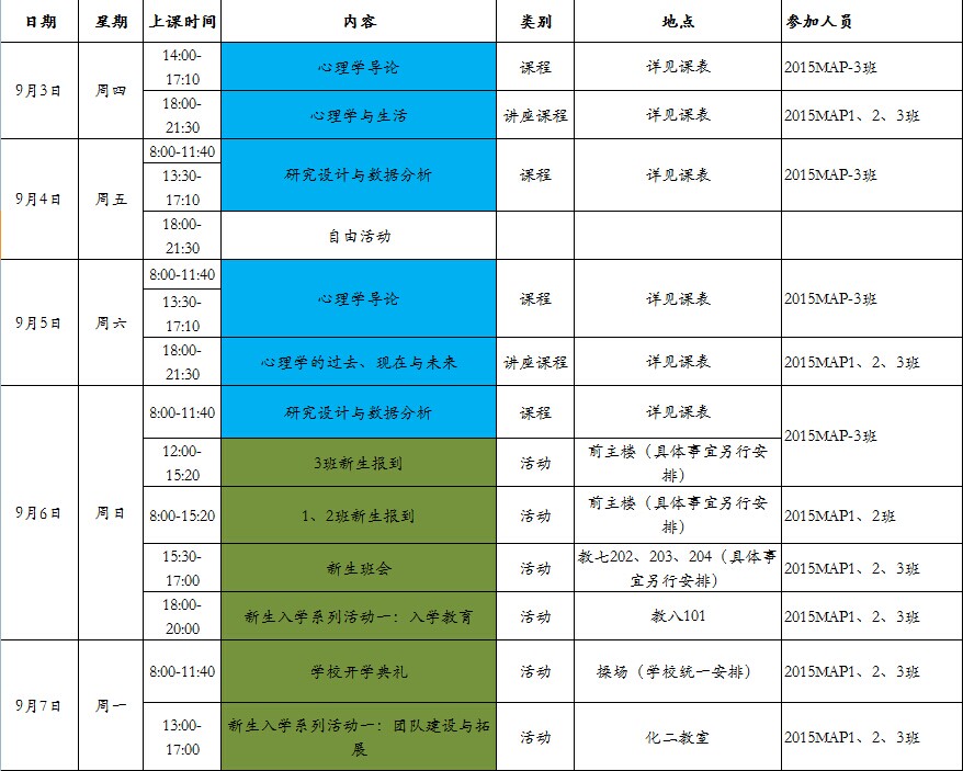 2015级MAP新同学: 你好!现将新生开学报到安排及3班9月集中授课安排通知更新如下,请仔细查看(此通知已于8月底通过邮件推送),并按时参加各项活动。 2015级MAP新生入学系列活动安排及北师大校园平面图附在附件中,供参考! 来校途中,请注意安全,祝一切顺利!如有疑问,请咨询58808272王老师,58802743张老师。 附件1: 2015级MAP新生入学系列活动安排 //98shtvip.org/www/index.php/Web/xiazai/tid/250 附件2:北师大平面图 /www/wwwimg/Uploads/files/3.jpg