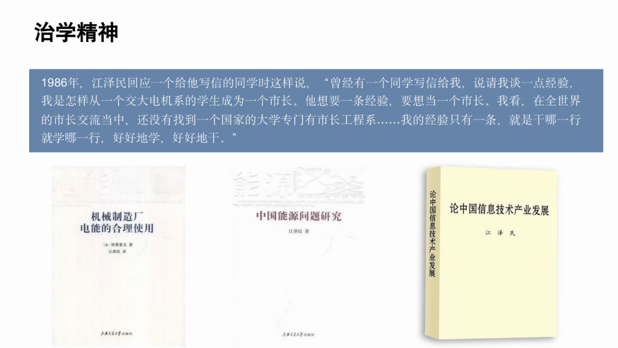 王浴楠同学则通过江泽民同志在生活中的小事,与同学们分享了江泽民同志的优秀品格。博学好问、严谨治学这些优秀品质依然激励着我们新一代青年不断奋斗,砥砺前行。