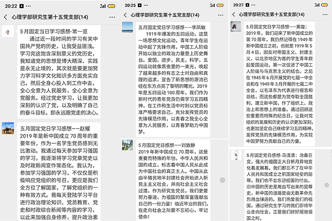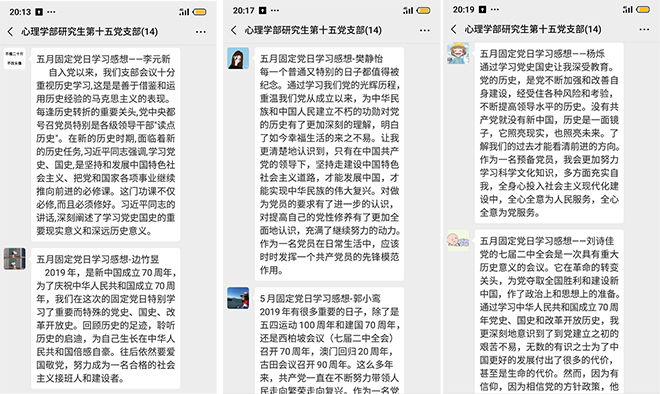 2019年5月22日,研究生第十五党支部于98色花堂 心理健康服务中心举办了“庆祝中华人民共和国成立70周年党史、国史、改革开放史等学习”固定党日理论学习活动。本次学习活动的学习材料有《2019年,你不可不知的党史国史纪念日-党史频道》、《习近平:在纪念五四运动100周年大会上的讲话-新华网》、《直播回看:习近平出席纪念五四运动100周年大会并发表重要讲话》。 本次固定党日的学习中,党员们认真地学习党史、国史等知识,并将自己的学习感想以文字的方式分享至党群中,如图所示: