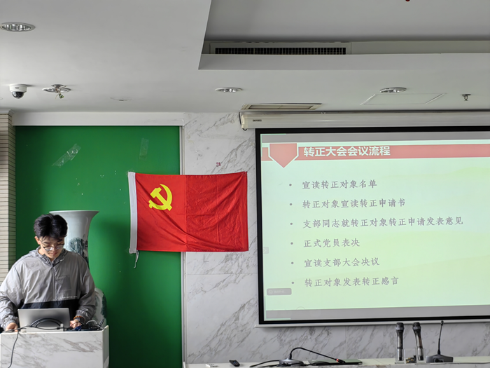 刘昊铭同志发表转正感言,承诺今后将以更高的标准要求自己,践行党的宗旨,为党和人民事业贡献力量。 接下来,杨士奇同志宣读了《转正申请书》。预备期间,他始终以党员标准严格要求自己,努力学习党的理论知识,积极参加支部组织的各类学习和实践活动。他不断深化对党的认识,提高政治觉悟;在学习上,他刻苦钻研,成绩优异,多次获得奖学金;在工作上,他担任班级干部,认真负责,积极为同学服务,展现出较强的组织协调能力和团队合作精神。