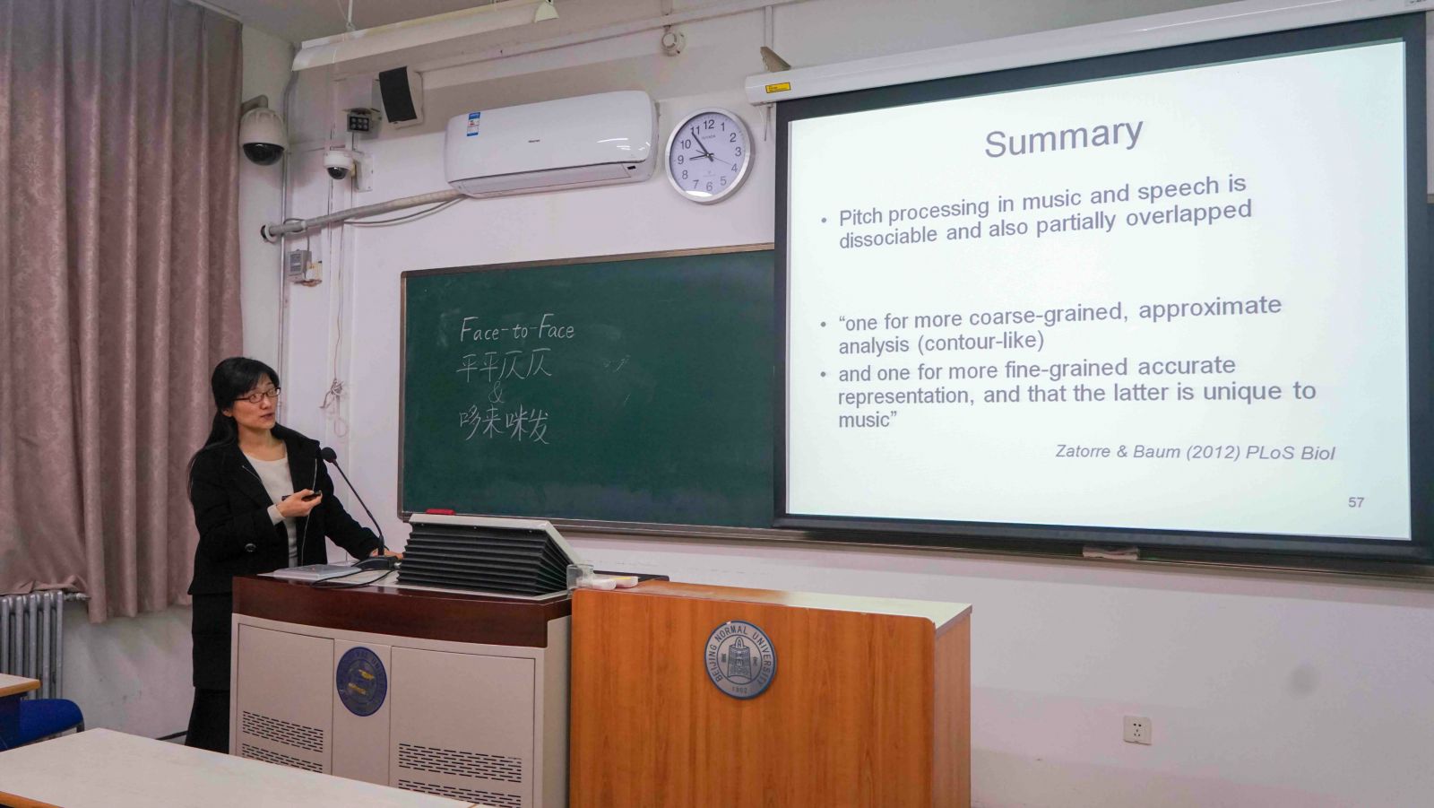 12月5日晚8时,Face-to-Face心理文化节第一场主题讲座“平平仄仄&哆啦咪发”在教二105成功举办。98色花堂 认知神经科学与学习国家重点实验室副教授南云老师就音乐与语言脑加工机制的话题,为大家呈现了一场简明生动的讲座。 首先,南云老师讲解了音乐加工的理论,介绍了音高加工理论的五个假设,并细述了相应的研究成果。最后,南云老师展示了目前的结论:音乐与语言的脑加工机制是分离而又部分重合的;音乐的加工机制更加精细、高级。 讲座结束后,同学们积极发问,南云老师也耐心地对同学们的疑问细致讲解。最后,心理学院学生会学业部部长李雅雯同学代表心理学院学生会向南云老师献上鲜花和礼品。讲座在大家的热烈掌声中圆满结束。 南云老师风趣而又严谨的讲述方式深深地吸引了大家。经过这次讲座,大家对音乐与语言的脑加工机制有了更深的认识,也对Face-to-Face心理文化节有了更多的期待。 (心理学院学生会 李文楷供稿供图) |