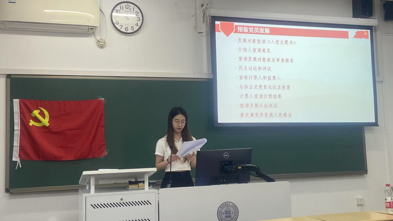 第一次发展大会于10时召开,主要讨论马静薇同志的发展事宜。发展对象马静薇同志首先宣读入党志愿书。随后,其两位入党介绍人宣读介绍人意见,支部书记宣读政治审查报告提请支部大会讨论并主持民主讨论和评议。接着,全体正式党员同志进行无记名投票,计票完毕后由支部书记宣读支部大会决议。经投票表决,全票通过发展马静薇同志为预备党员。随后,马静薇同志向支部表达了感谢。