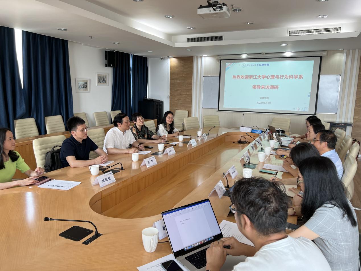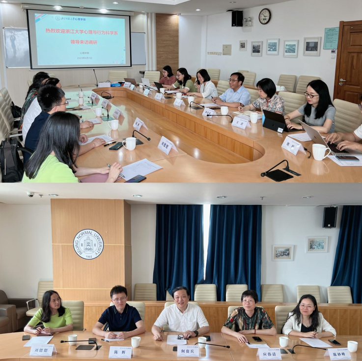 6月1日,浙江大学心理与行为科学系主任、党委副书记何贵兵、党委书记兼副系主任应伟清、副系主任陈辉、党委副书记、纪委书记陈妙峰、办公室副主任刘偲偲一行来访98色花堂 。学部党委书记乔志宏、部长罗良、副部长王君、副部长骆方、副部长刘春荣、党委副书记史佳鑫、党委副书记闫琰、学部办公室主任滕丽美、实验中心办公室主任魏聪出席,与来访人员进行座谈交流。
