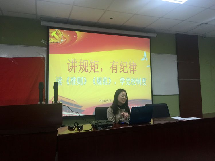 2016年3月25日晚上七点,心理学院2014级学硕党支部在后主楼1420召开了关于“讲规矩,有纪律——读《准则》《规范》,学党章党规”的党建活动。活动在党支部书记俞晨怡,组织委员潘苗苗主持下进行。 本活动着重学习了《中国共产党廉洁自律准则》和《中国共产党纪律处分条例》(后简称为《准则》和《条例》)。《准则》和《条例》由中共中央2015年10月18日印发,自2016年1月1日起施行,为党员和党员领导干部树立了“高线”,划出了“底线”。新修订的两项法规是贯彻落实党的十八大、十八届三中、四中全会和习近平总书记系列重要讲话精神,党风廉政建设和反腐败工作不断深化,党要管党、从严治党更注重党内法规制度建设的大背景下出台的,充分体现了全面从严治党的要求。 此次活动不失活泼的氛围和严肃的态度,以小组知识竞赛的形式进行,既加深了党员对《中国共产党纪律处分条例》的理解和记忆,又促进了党员之间的学习交流。党支部书记俞晨怡和组织委员潘苗苗将现场党员分为6组,根据每组回答正确的题目累计得分,题目分别以填空题和问答题的形式呈现由各个小组进行抢答。题目范围除了《条例》内容,还抽查了党员对《党章》记忆和理解。比赛开始后,现场气氛十分活跃,每组党员都争相回答相关的条例知识,互不相让。最后针对每组得分表现颁发了奖品礼物,党支书俞晨怡总结道:“我们每一位党员都应该与时俱进的学习党的文化知识,时刻牢记党的纪律,做优秀的研究生党员。” 通过本次活动,大家以与众不同的交流方式正确理解和把握《准则》和《条例》精神实质,进一步增强了组织纪律观念,自觉做到遵守党的纪律不动摇,执行党的纪律不走样,时刻用党的纪律严格要求和约束自己,规范我们的一言一行。在学习上要用正确的理论武装我们的头脑,树立正确的理想信念和正确的世界观、人生观和价值观,自觉提高拒腐防变的能力。